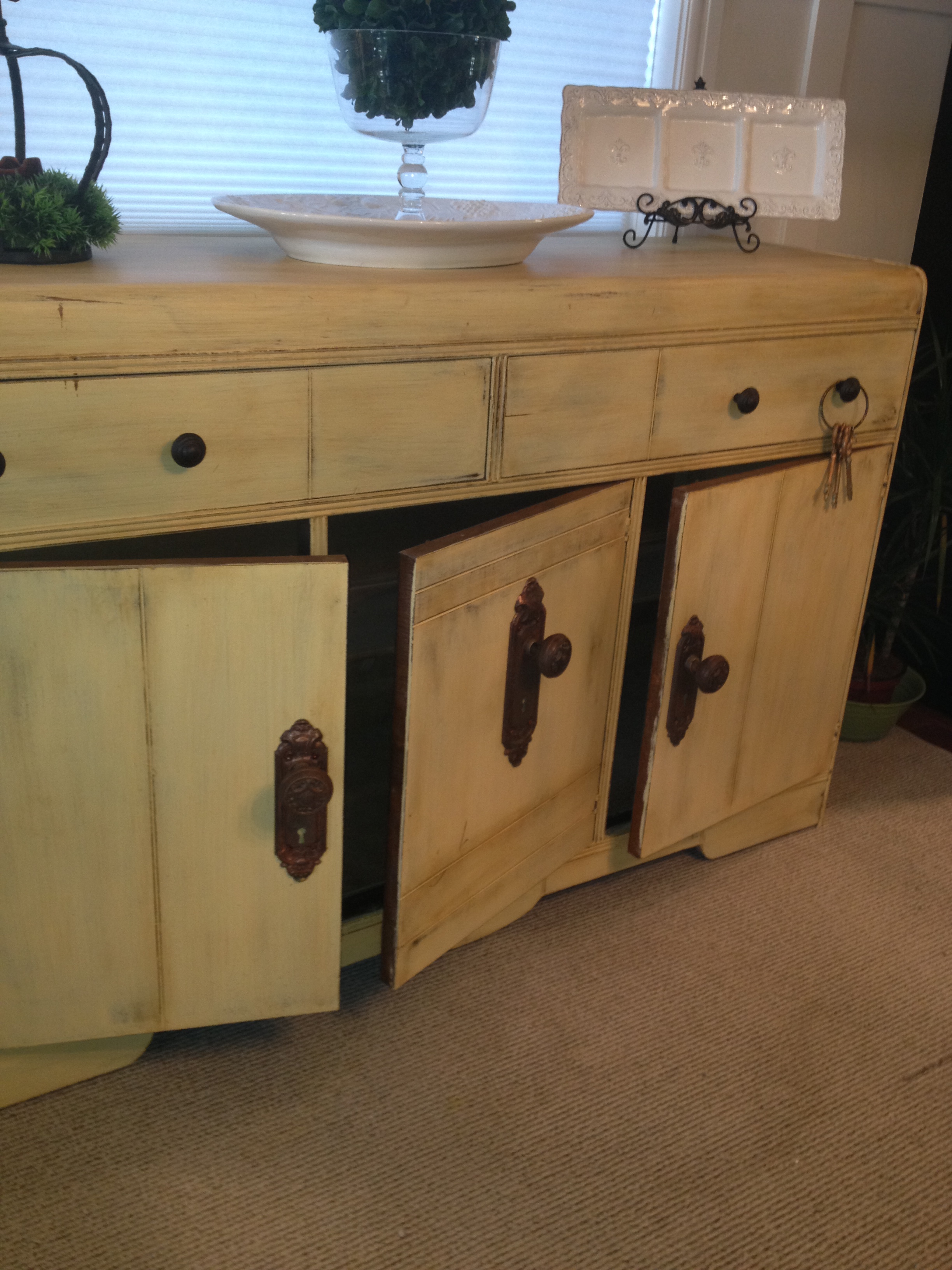 Today I’d like to share with you my first try using chalk paint.  I found this antique sideboard at a thrift store and saw great potential in it.  Living where I do in a small Alberta town here in Canada it isn’t easy to find such things as milk paint or chalk paint.  So when I was browsing around a antique store and saw that they were selling these types of paint I got super excited!!!  I didn’t have to make my own anymore…Yeay!!!!