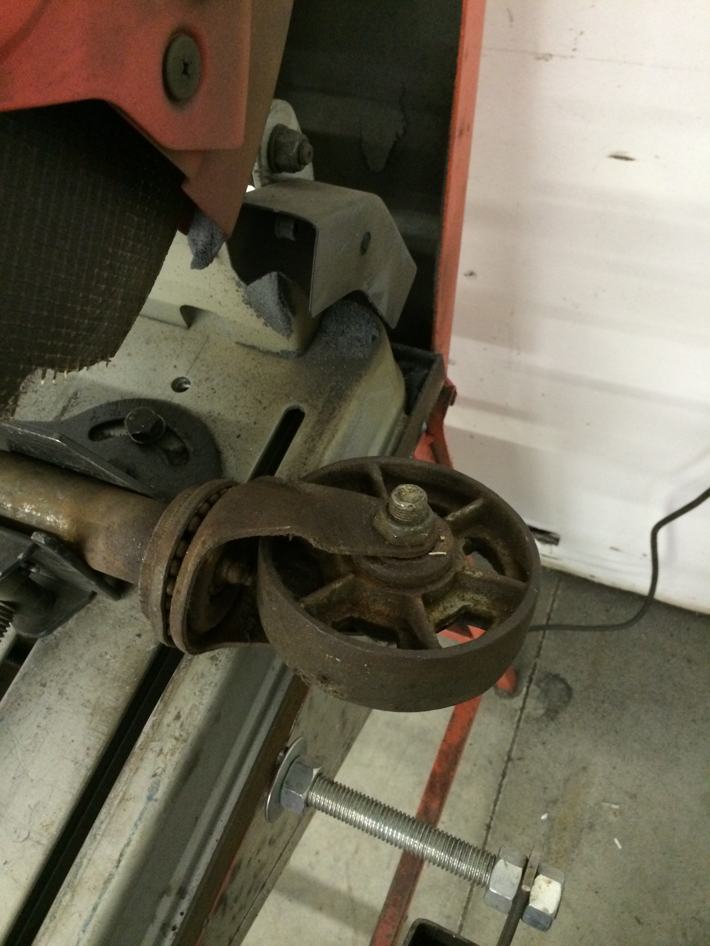 So after he cut off that long piece, I had him use the welder to weld a metal plate to the top part of the wheel. Then he drilled holes through the metal plate so we could attach the wheels with screws to the trunk.