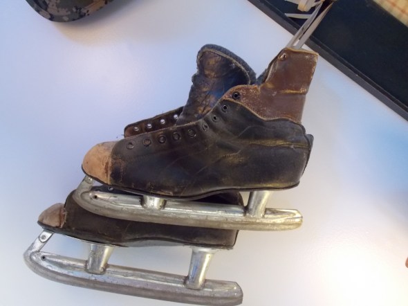 The quilted wall hook hanging also comes from the same antique shop as the dresser. The hooks hold antique skates that are etched on the blade “the Toronto Maple Leafs”.