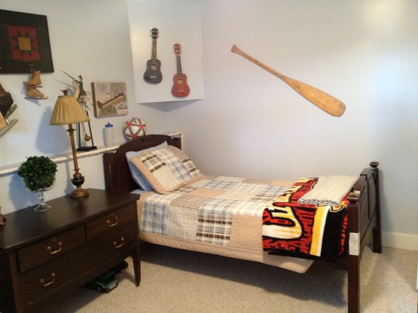 These beds are actually bunk beds that we have just as twin beds, the ceiling is high enough but there is a pony wall around 2 sides of the room and I think it just looks awkward with the ledge….I hate the ledge!!! It is nothing more than a junk and dust collector. When I painted the room I also painted the ledge and instead of the outdated trim on it I used some rope from the local hardware store to trim up the raw edges. This gave it a bit of a masculine and nautical feel, and it was cheap to do.