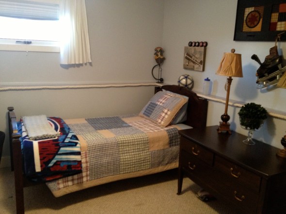 Each has their own side with their own stuff…I think though that soon it will be time to give their quilts an update as they are starting to get faded and worn from washing and wear…They each love hockey so they have their team blankets too. They also have a love for aviation…naturally, as that is our life most of the time, their dad works on aircraft year round…