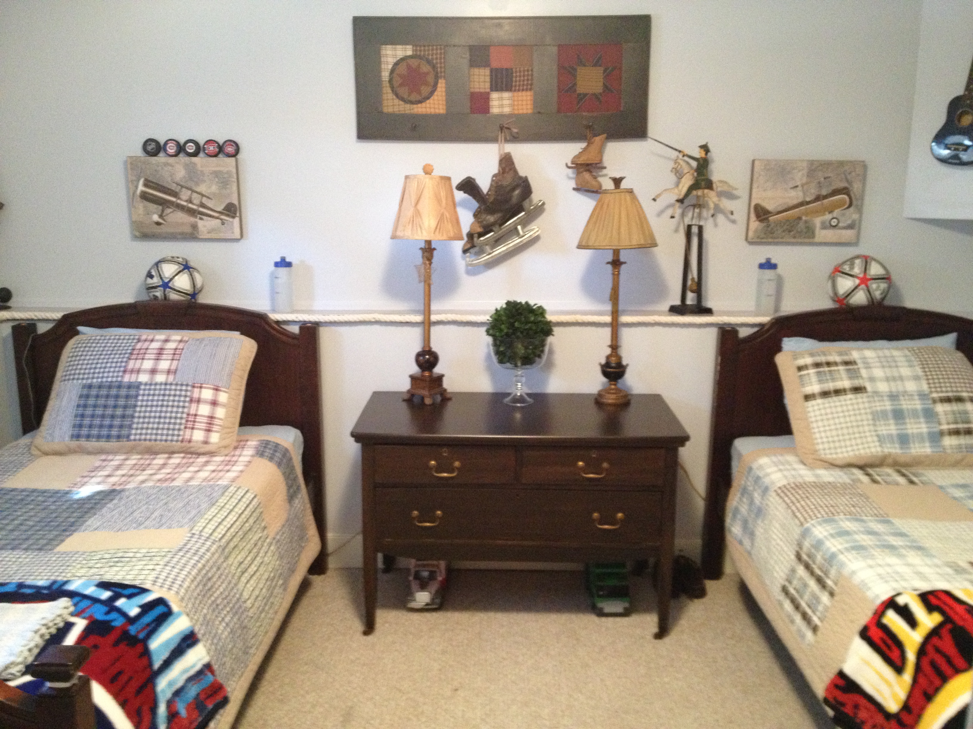 Each has their own side with their own stuff…I think though that soon it will be time to give their quilts an update as they are starting to get faded and worn from washing and wear…They each love hockey so they have their team blankets too. They also have a love for aviation…naturally, as that is our life most of the time, their dad works on aircraft year round…