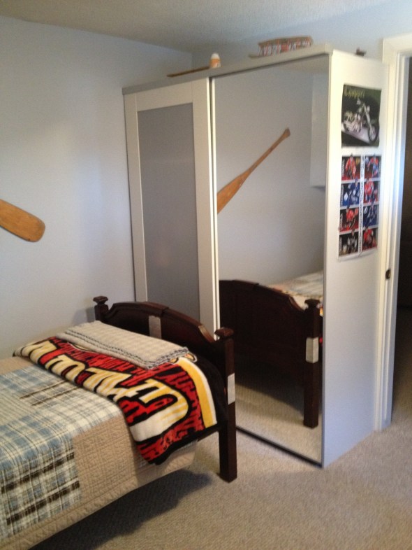 They Share a room on the fourth level of our 5 level split home. This room was most likely intended to be an office or craft room as it did not have a closet. We went to Ikea and bought one of their wardrobes in order to create a closet without committing future owners to having this room as a bedroom. It works great for now as they are only 9 and their clothes don’t take up a lot of space.