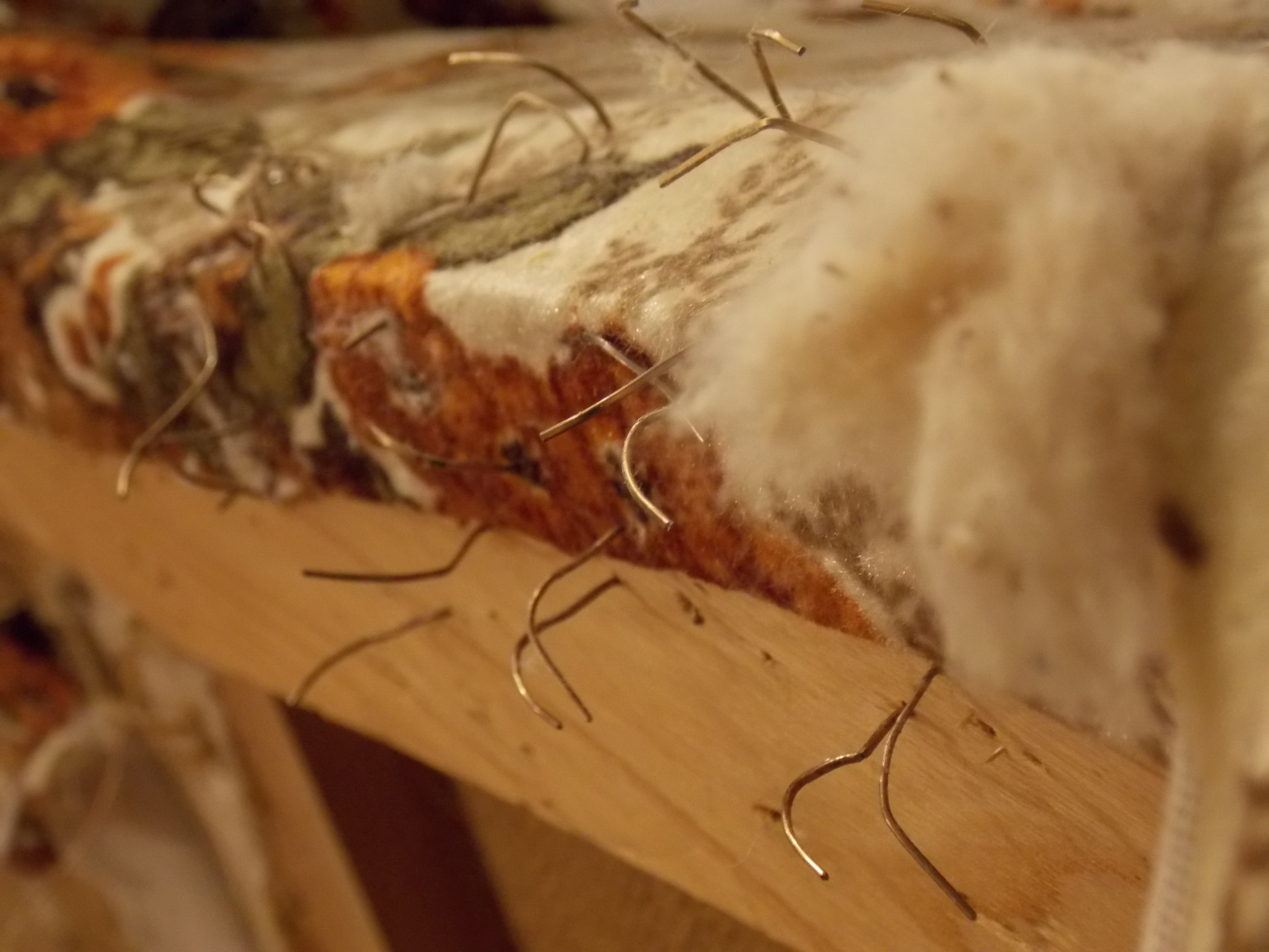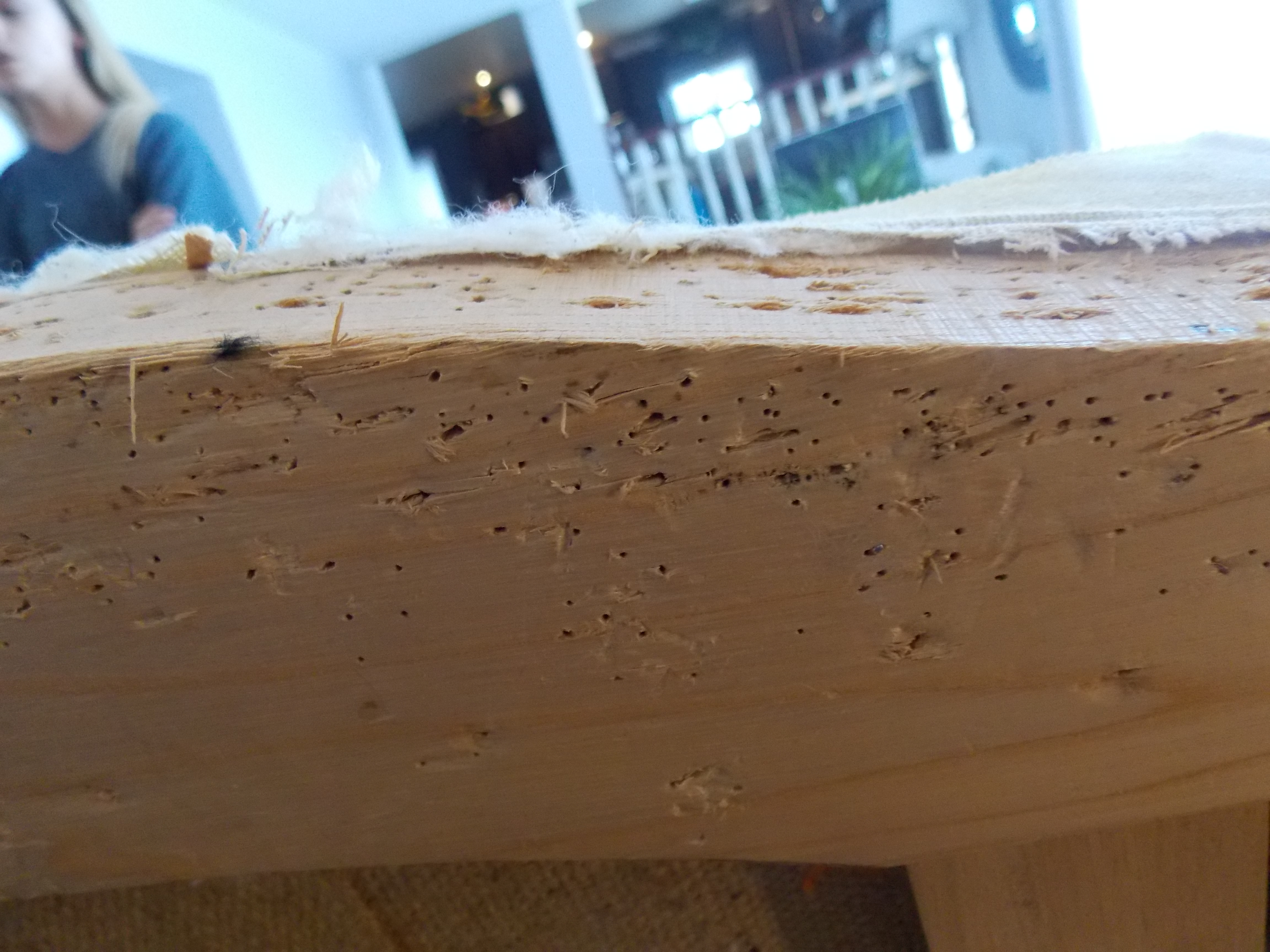 DSCN1523That black spot on the underside of the seat is actually cat hair!  Ewwwee!  Every little hole in the wood housed a staple….soooo many staples!!!