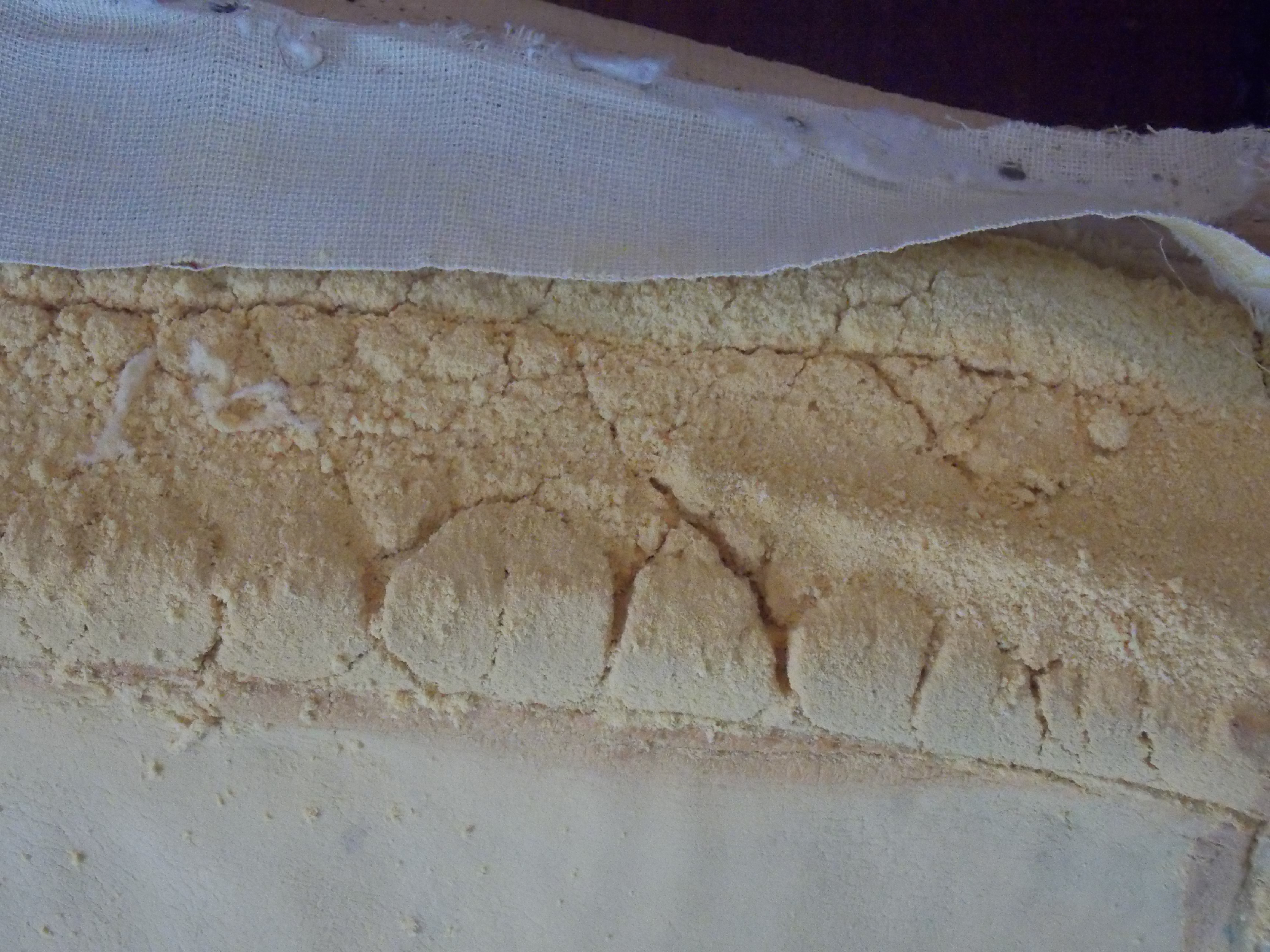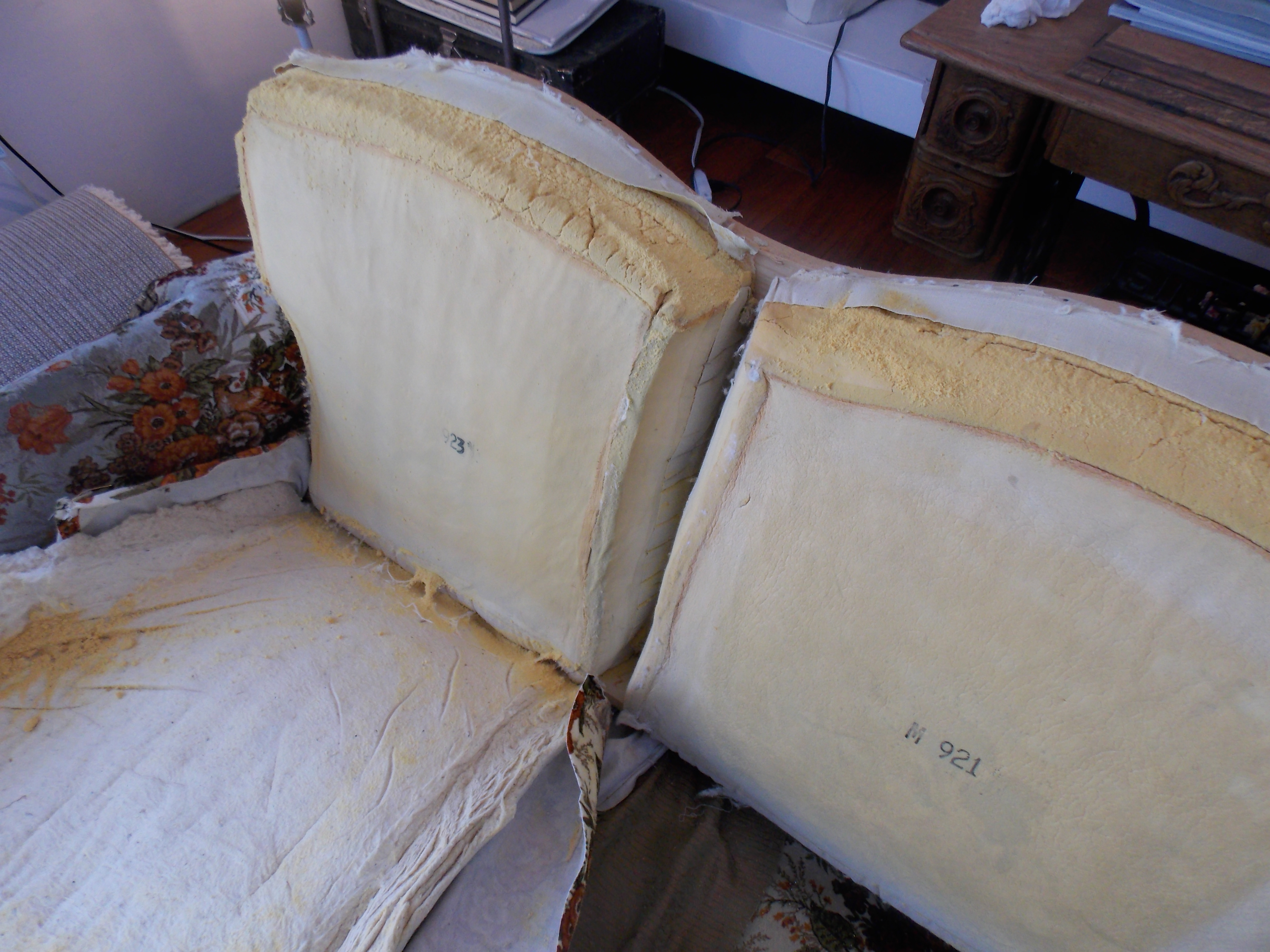 DSCN1548DSCN1545This poor little sofa!  Once stripped down to the bare cushions I realized that there would be no reusing anything from this sofa…the foam had decayed so badly that it turned to powder in my hands.  Very crumbly!  Soooooooo gross!!!!