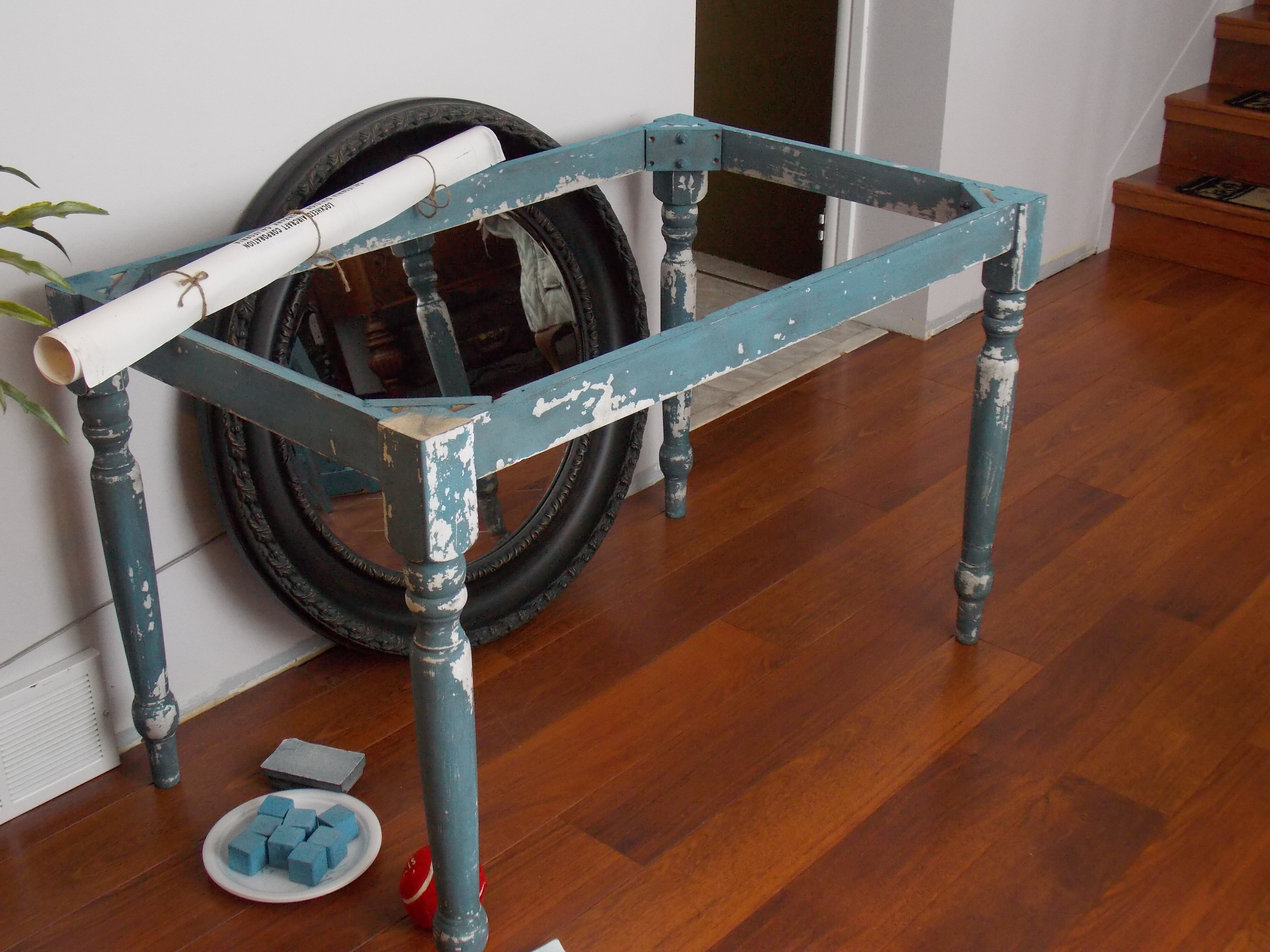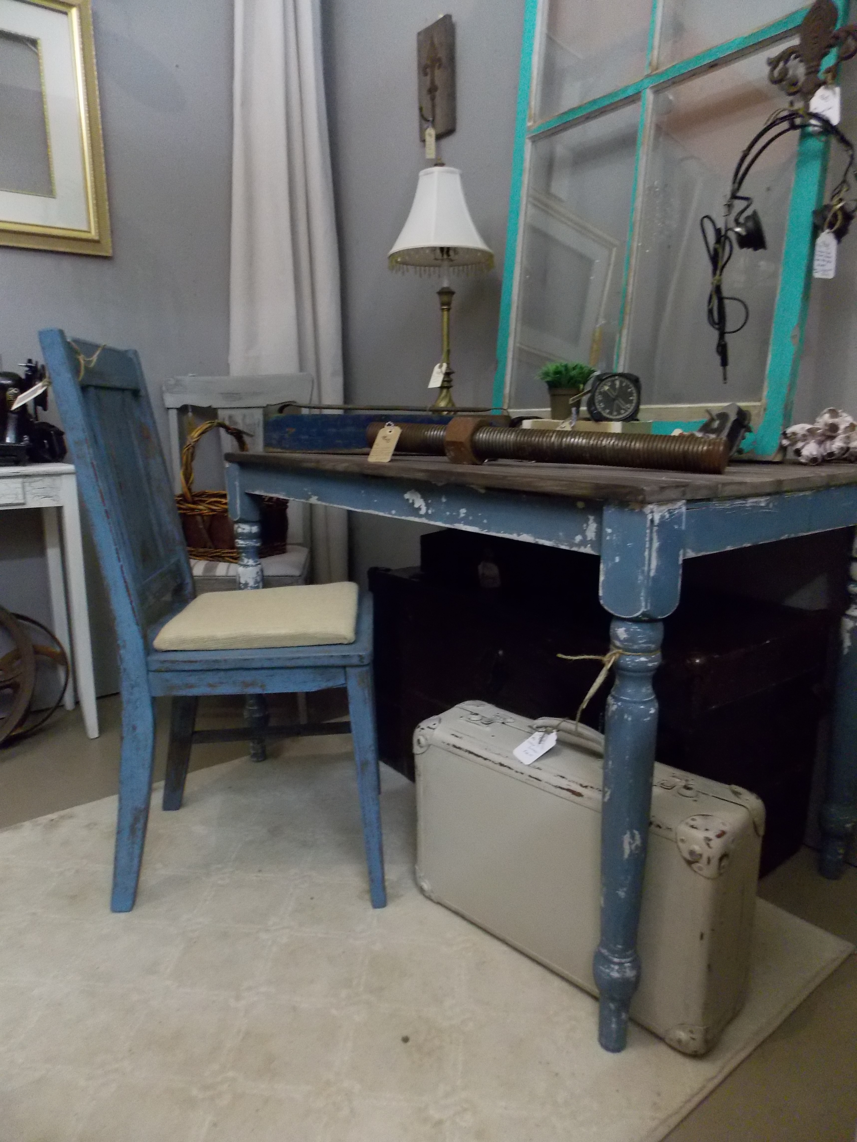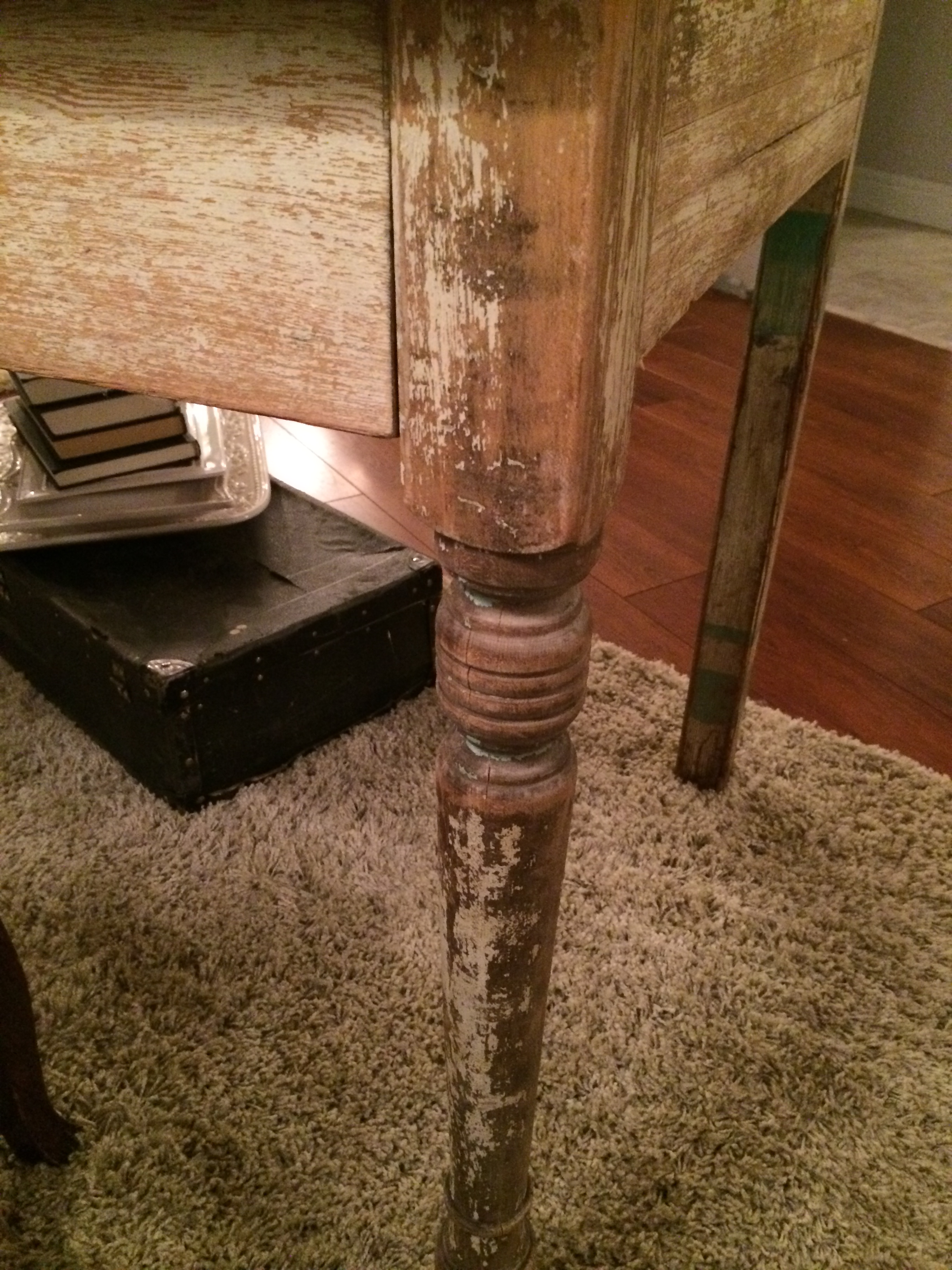 Last September I was gifted a beautiful antique primitive table by my sweet husband for our 15th anniversary. I have to say I am totally in love with this table. It serves as our computer desk right now and is , in my opinion, the best antique piece of furniture I own! It has so much character with it’s dry wood and chippy paint. I love that the fourth leg is a miss match…