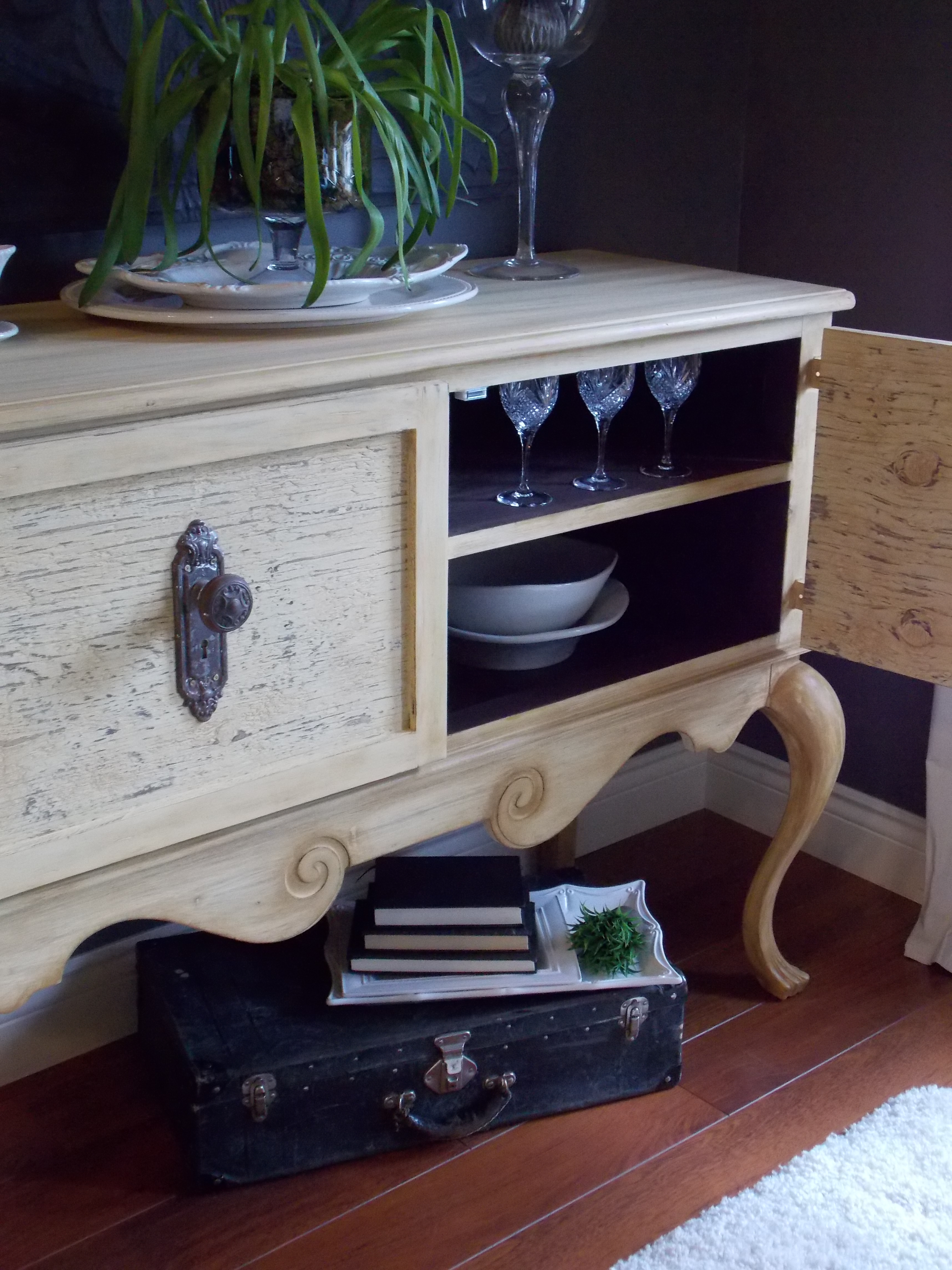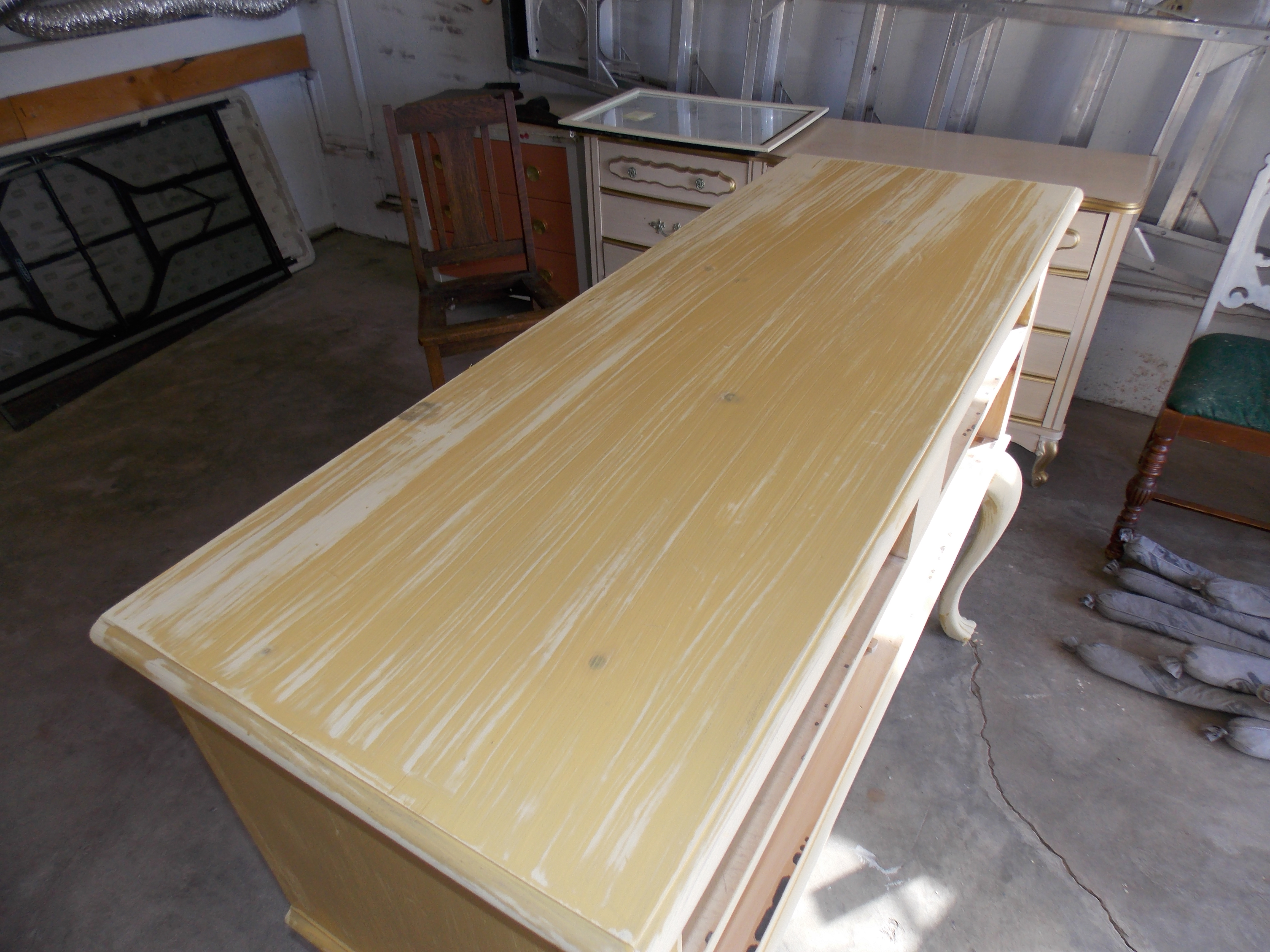 Next came filling in the holes with wood filler and sanding followed by the first coat of chalk paint on the outside. I used the color Wheat grass by The American Chalk Paint Co. This lady asked that I give this piece the same finish as a sideboard I had done previously. (click here to view that transformation)