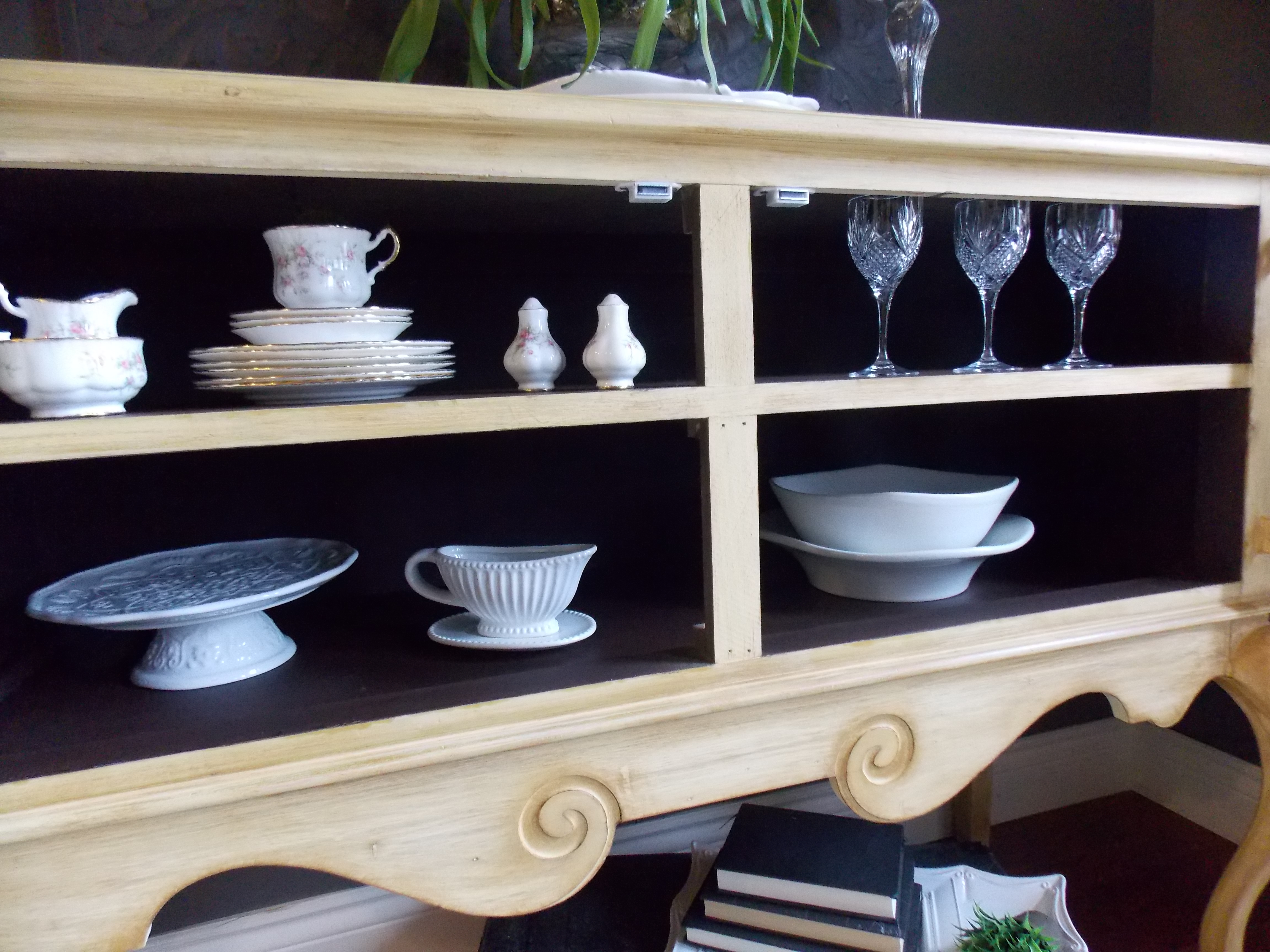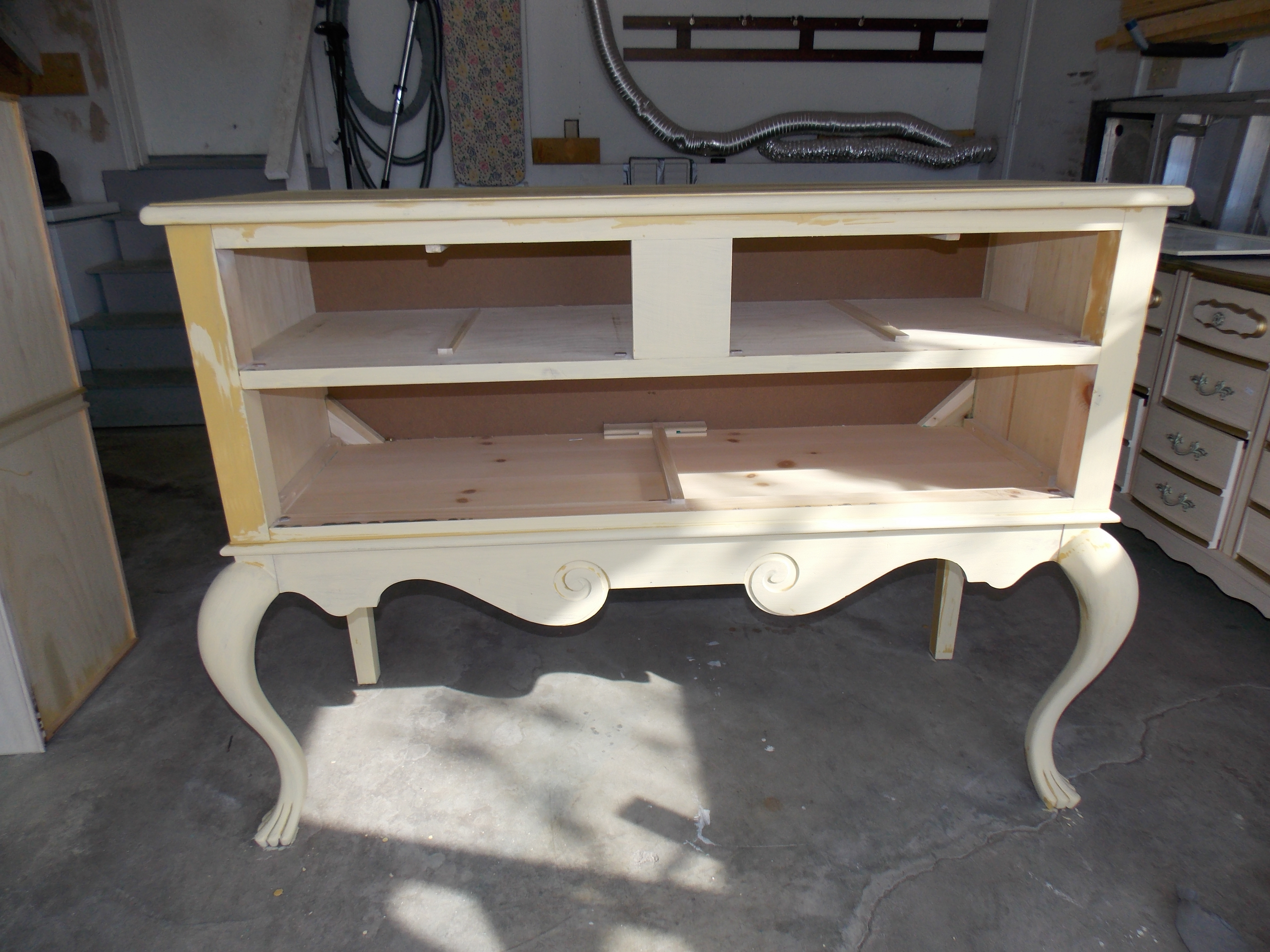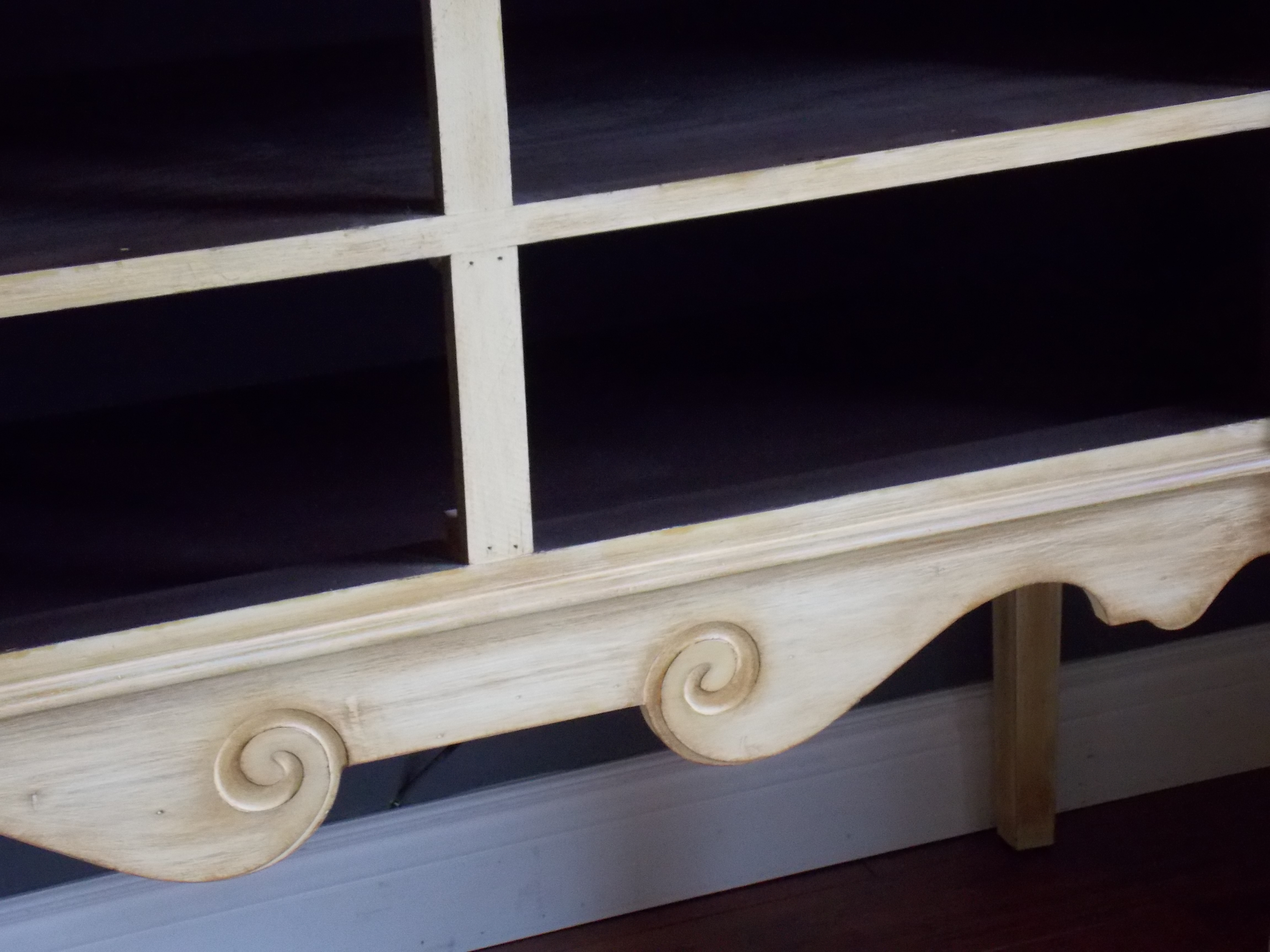 Back in March I was asked by a lady who works at the antique mall in town, if I would be able to do a custom treatment to a piece of furniture she had been considering purchasing from a vendor there. She saw this lovely piece and wondered if the drawers could be converted to shelving and doors. She was wanting to use it to store her china and wine glasses. I told her it shouldn’t be too difficult to do…so she bought it, and I took it home to start planning my attack on it!! :0)