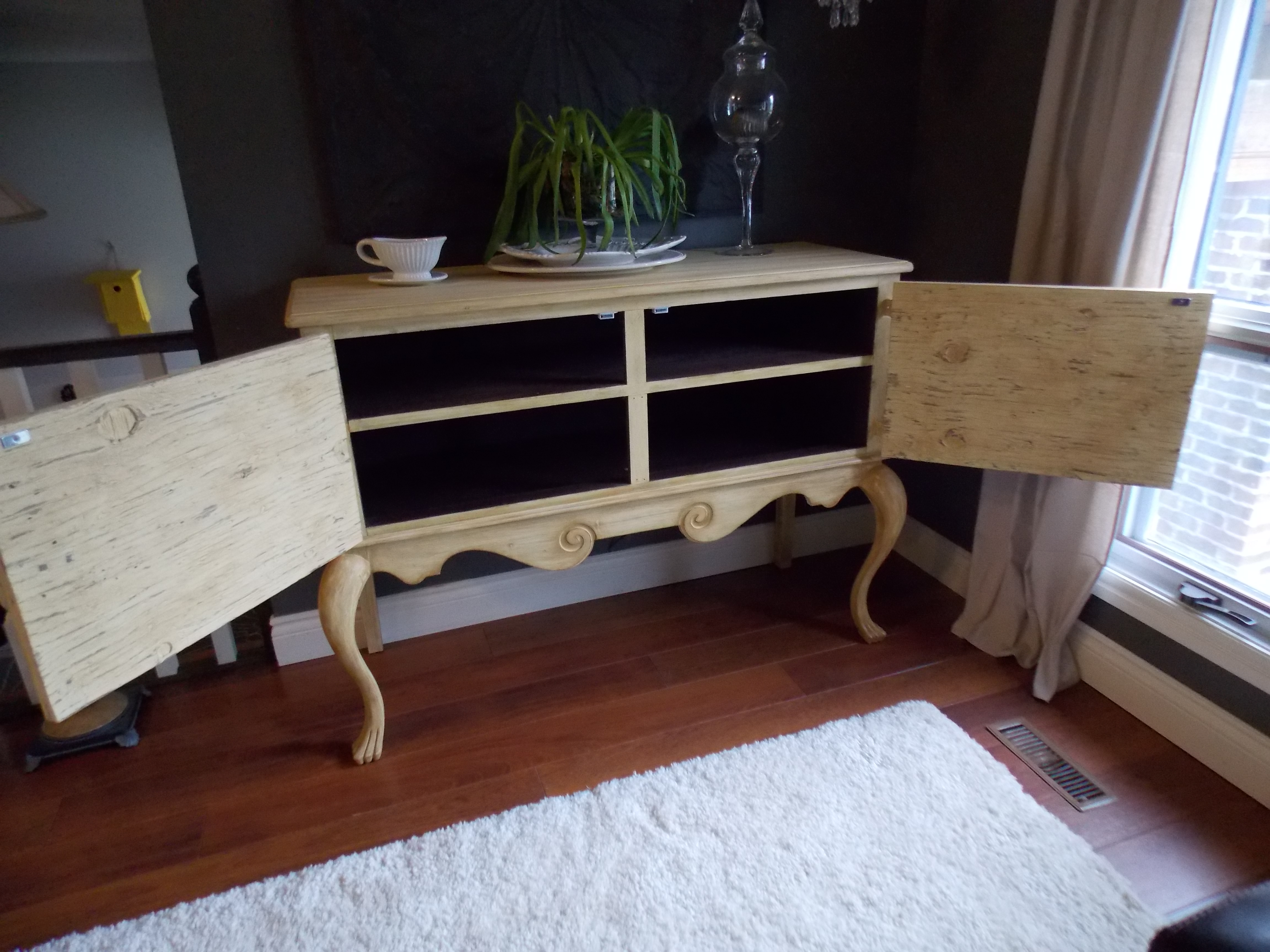 After the outside was complete I gave the inside a couple coats of Milk Paint in Miss Mustard Seed’s color Curio followed by a generous coat of Hemp Oil. Then My Dearest Husband was kind enough to craft me some doors for the cabinet. We used reclaimed wood for this… I think they turned out beautifully rustic. Combined with my last set of salvaged door handles of a hundred year old house, they really compliment the piece!