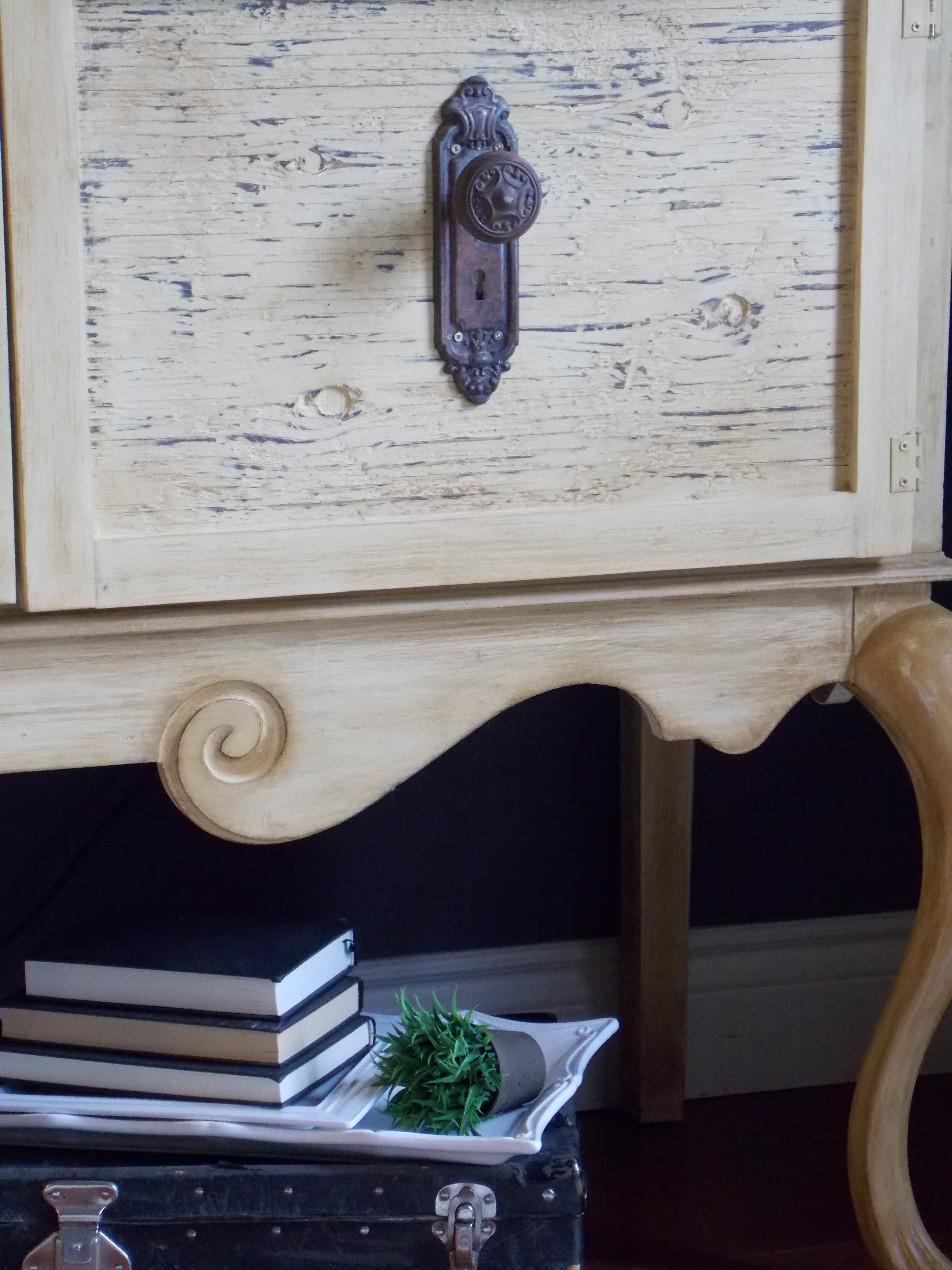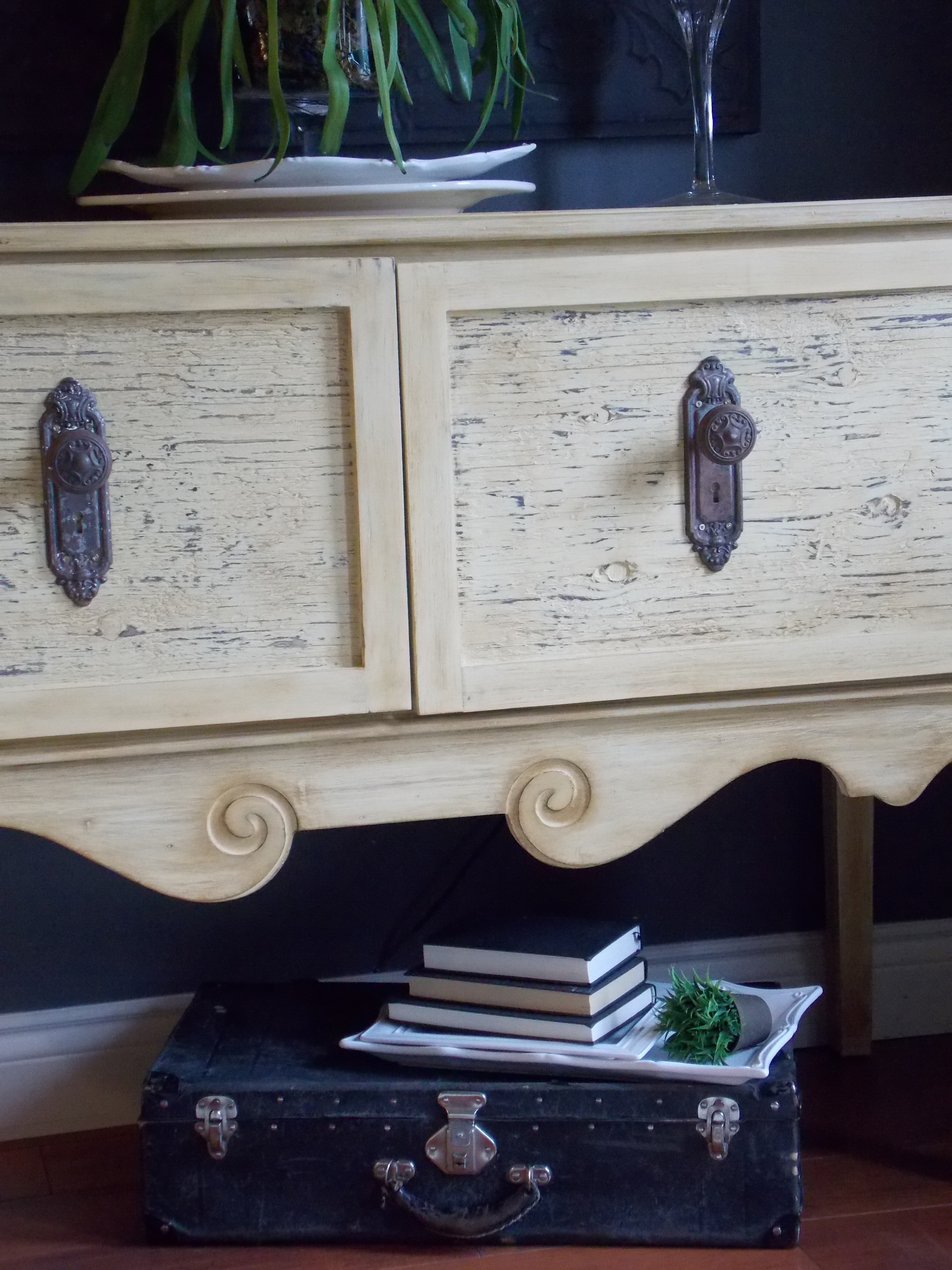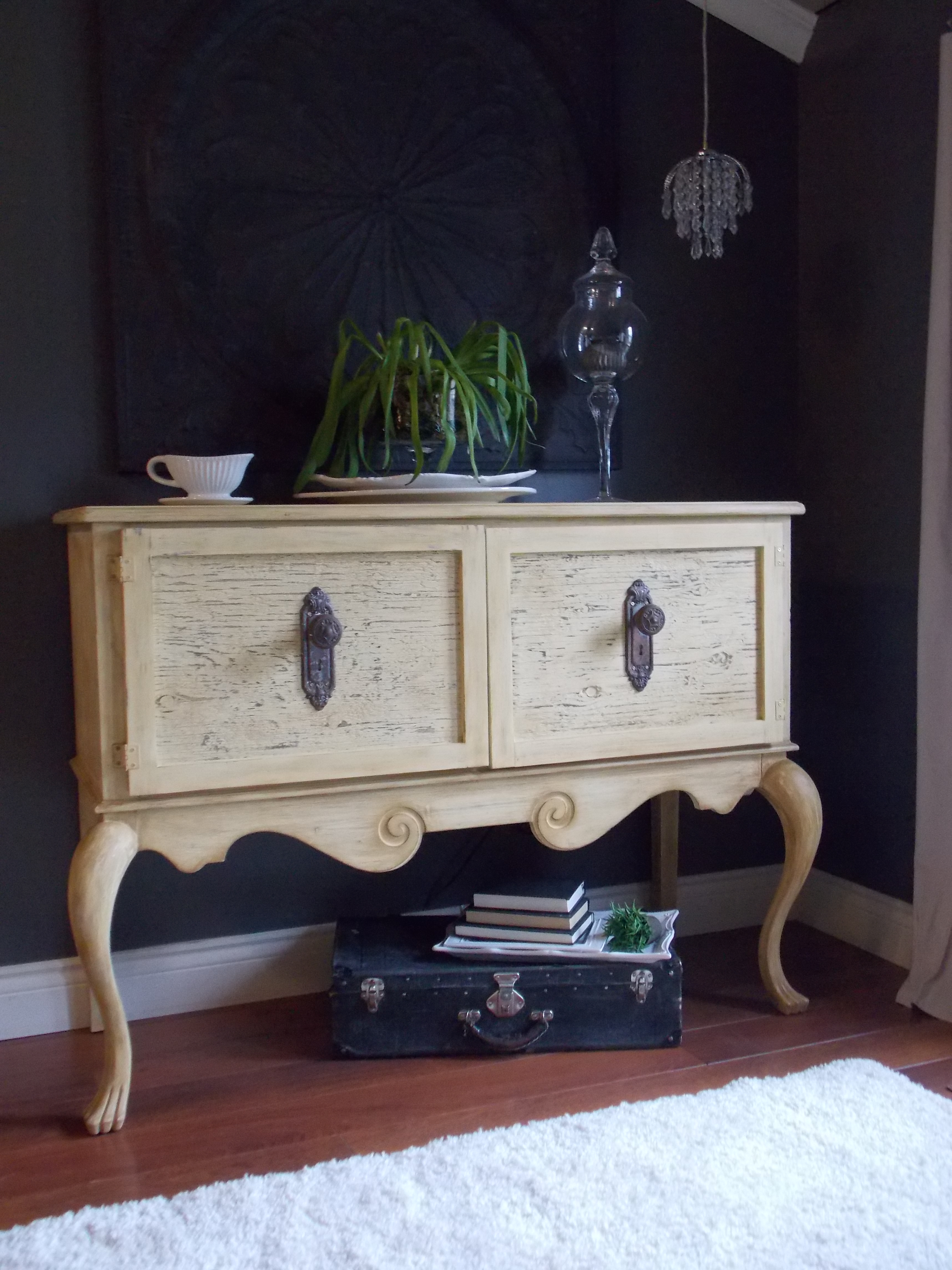 This color dries really light, almost a butter color. I gave it 3 thin coats of paint with a light sanding in between to get rid of any brush strokes. After that I went over the whole piece with a brush loaded with a small amount of dark antiquing wax also by American Paint Co. I find their antiquing wax to be a little rusty in color when applied to the Wheat grass chalk paint. It really gives a nice smooth finish after some buffing.