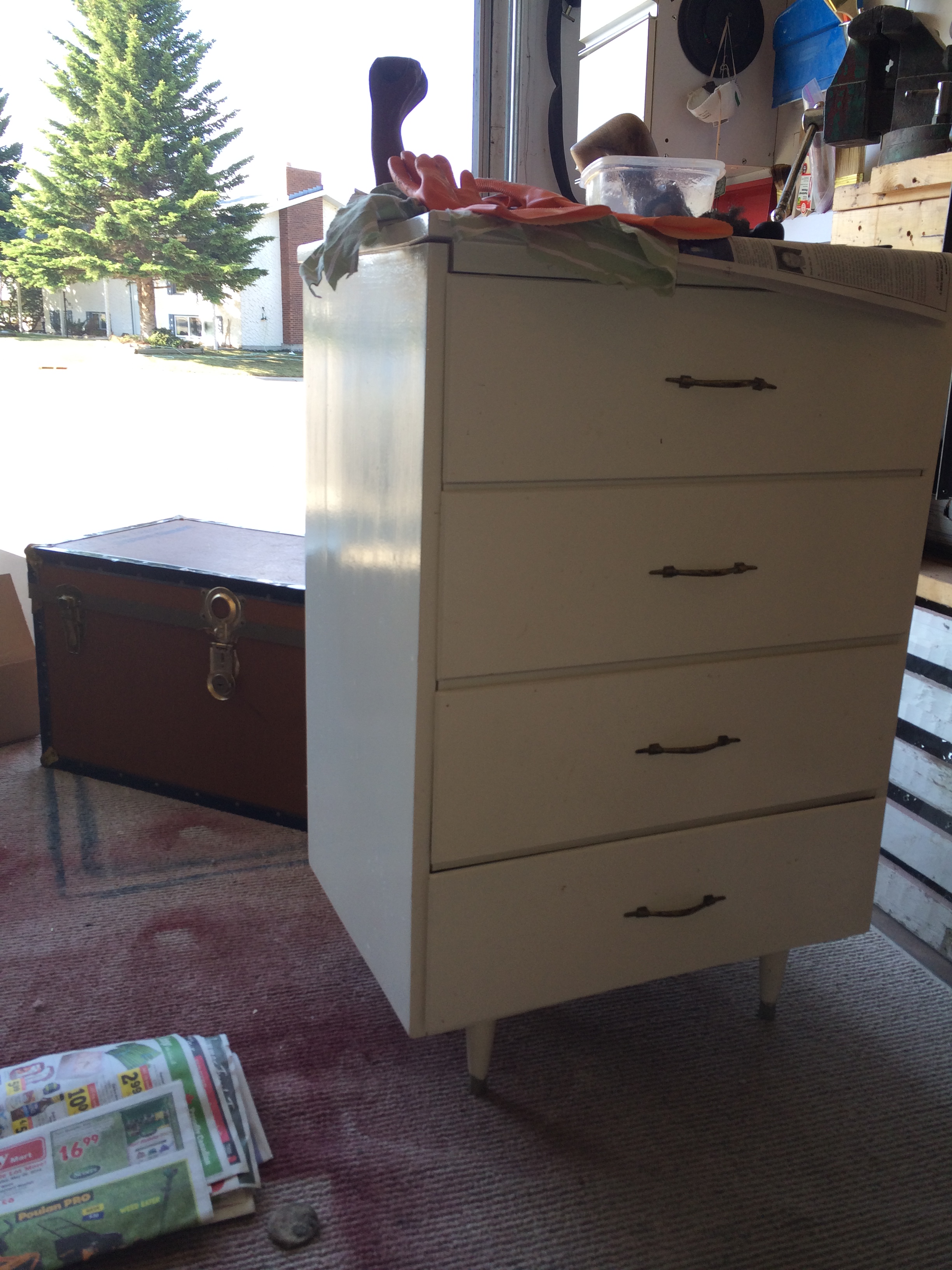 What do wild horses, Uncle Sam and surf board have to do with each other??? Well… they are the new colors I tried on a little chest of drawers I had in my garage. This cute little chest of 4 drawers was in need of a make over…needed a little dressing up…some character. Well, character is certainly what it got! Before…