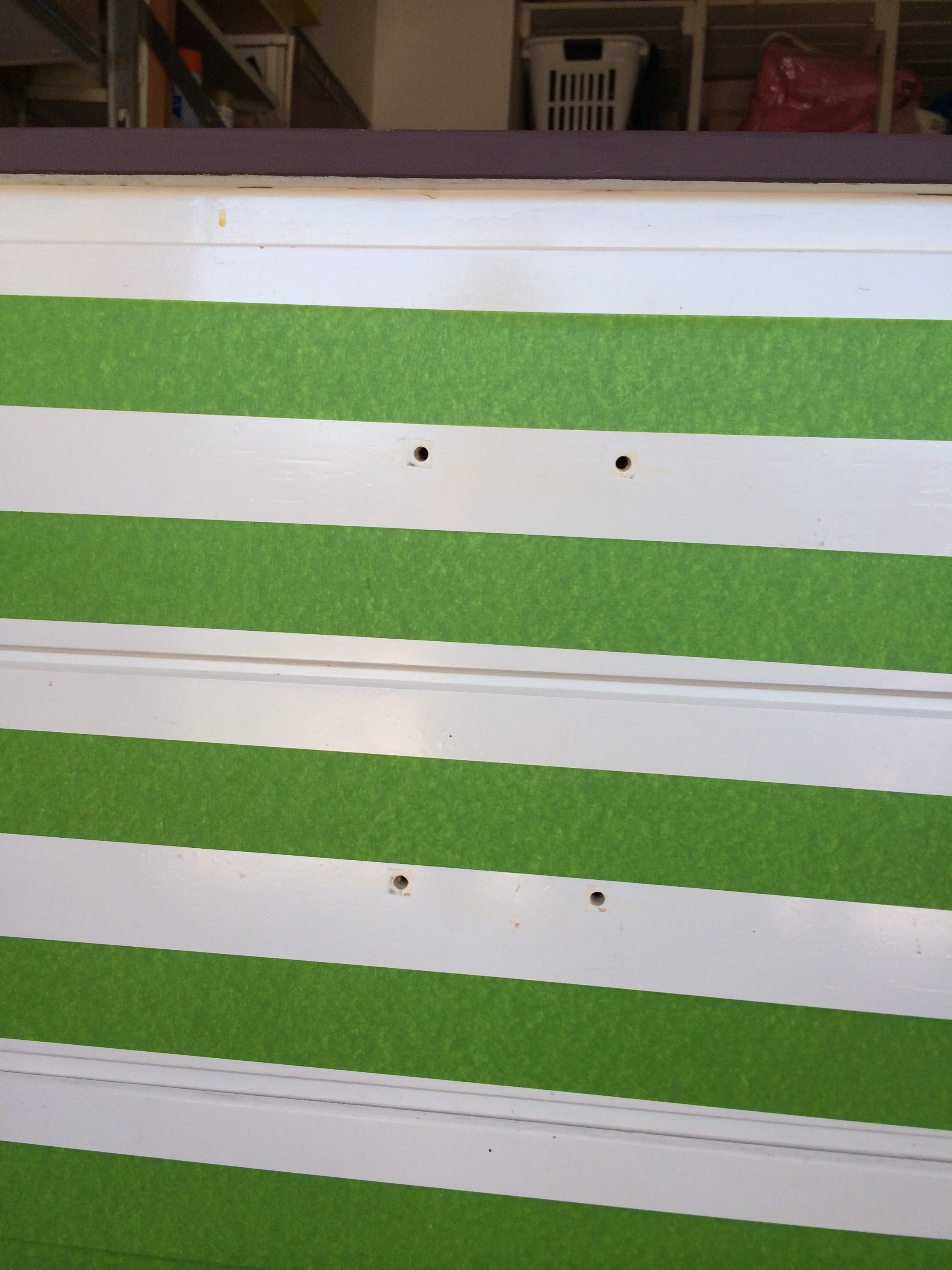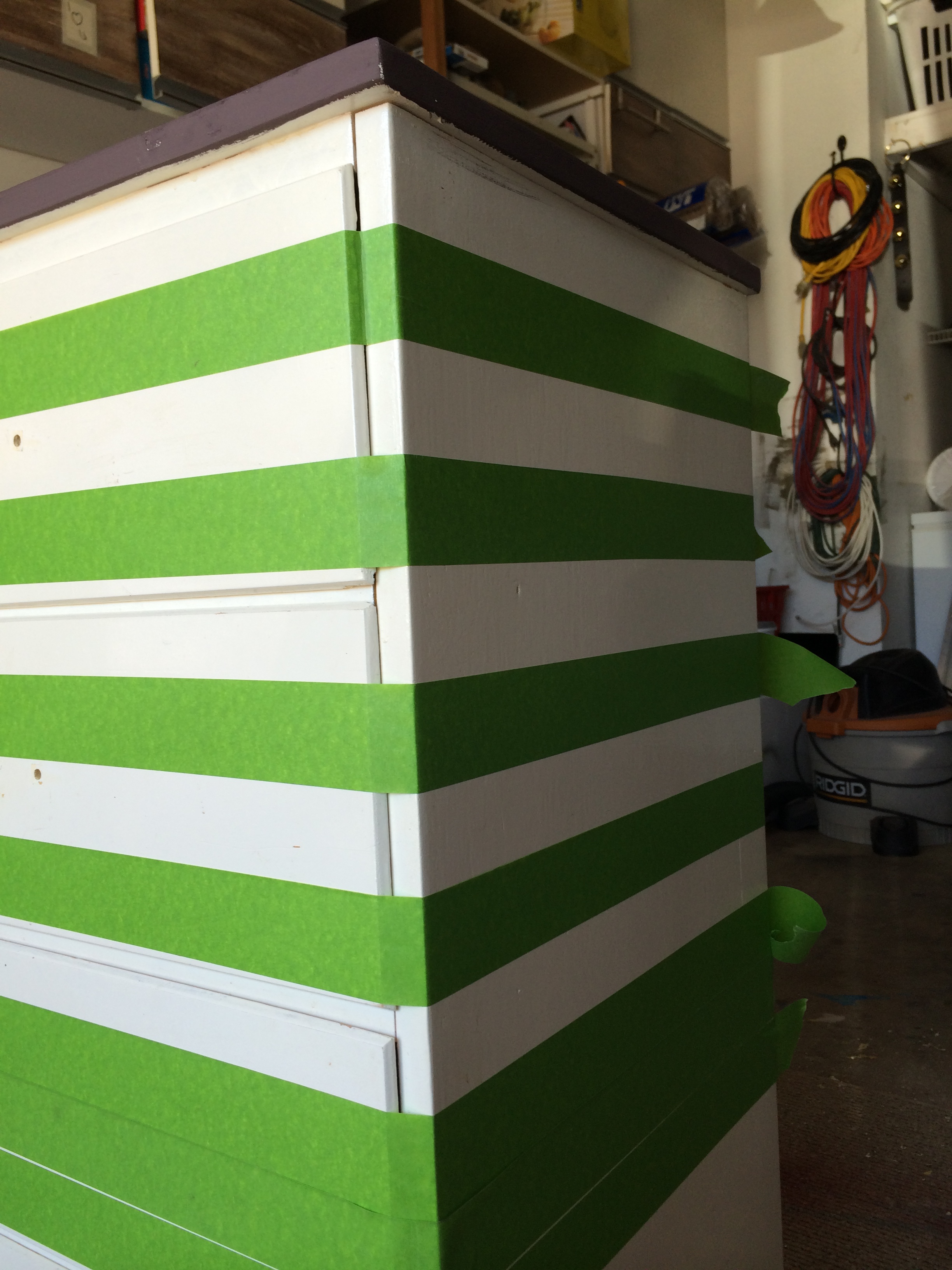 I decided as well that I would love to do something a little “beachy” so why not give it some stripes? I used Frog tape to tape off horizontal stripes all the way around the entire piece.
