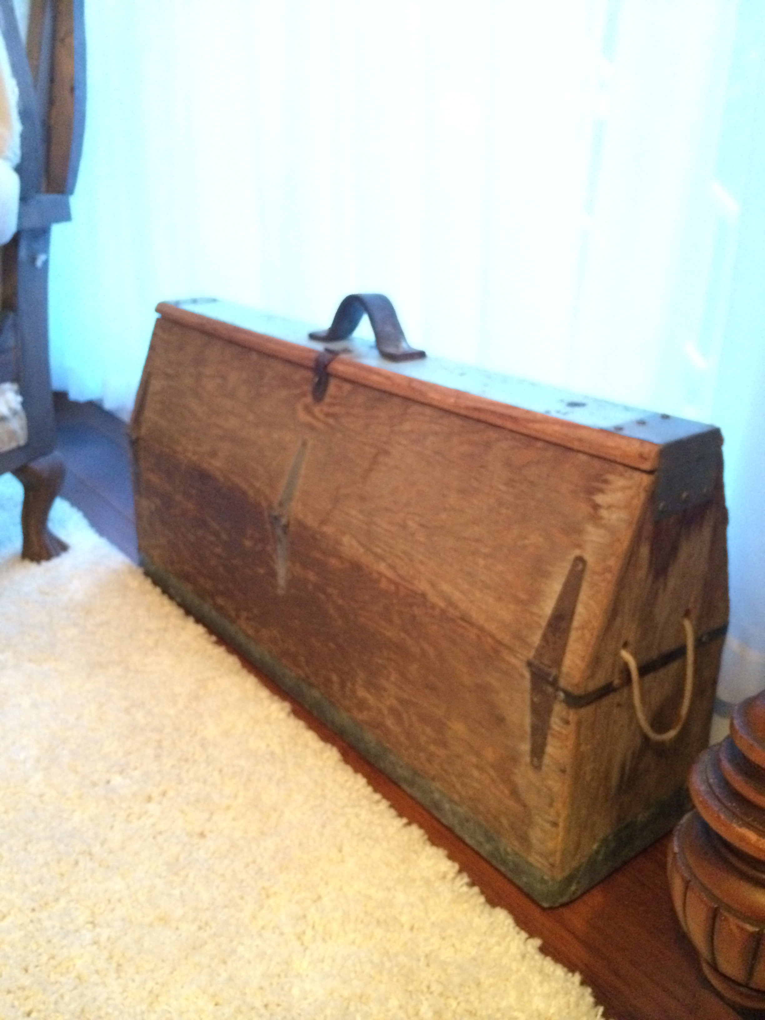 This is the carpenter’s tool chest, I really like the unique shape and look of this wooden box. It even has a little vintage green/blue paint on top…