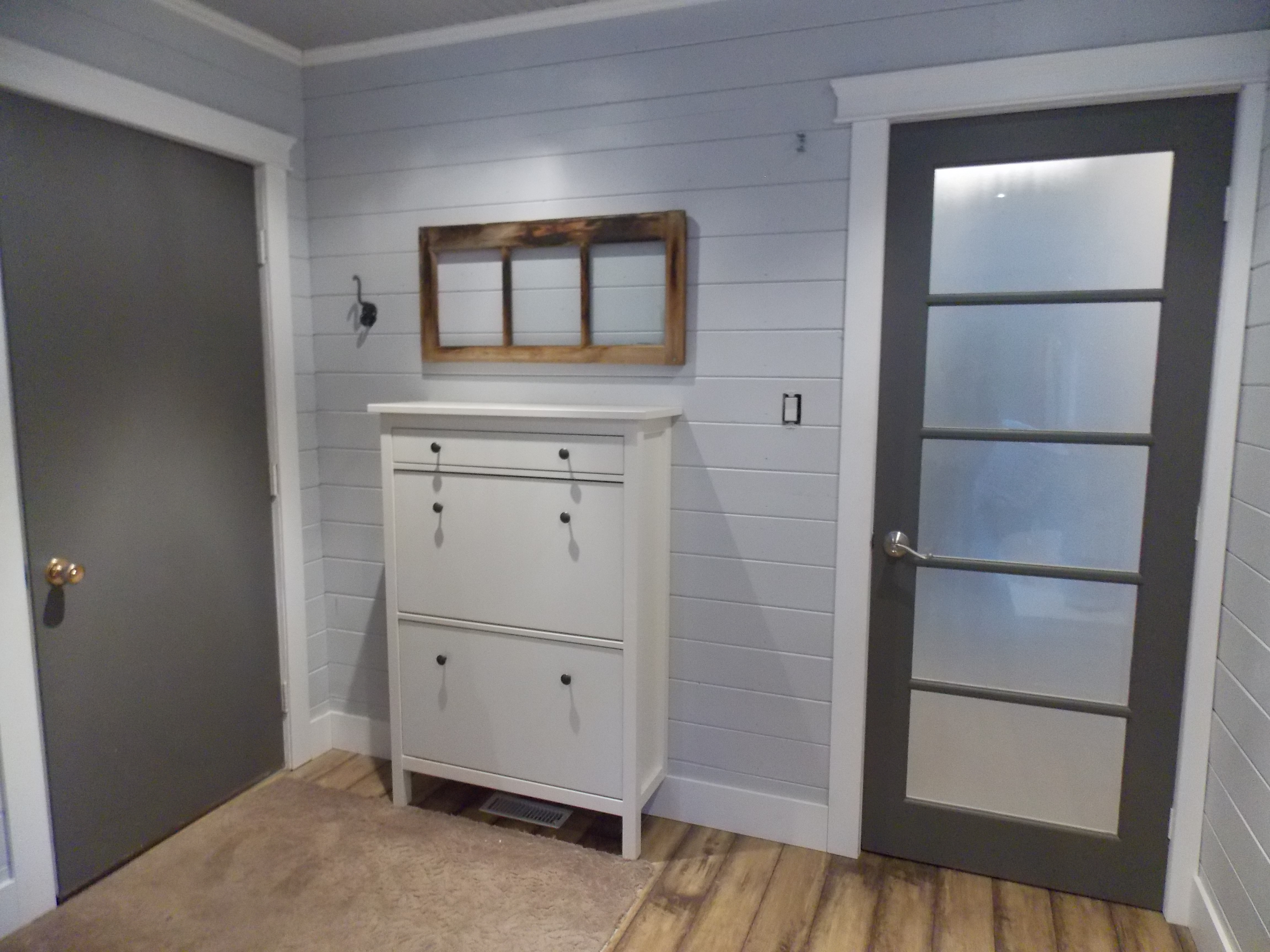 This is the view of the other end of the room and that door leads out to the double car garage. The white “dresser” is actually shoe storage and the drawers fold open to hold shoes and boots. this is a great idea as it looks like furniture but is actually storage. We got this at IKEA for a very reasonable price. (Under $150.00 cdn)