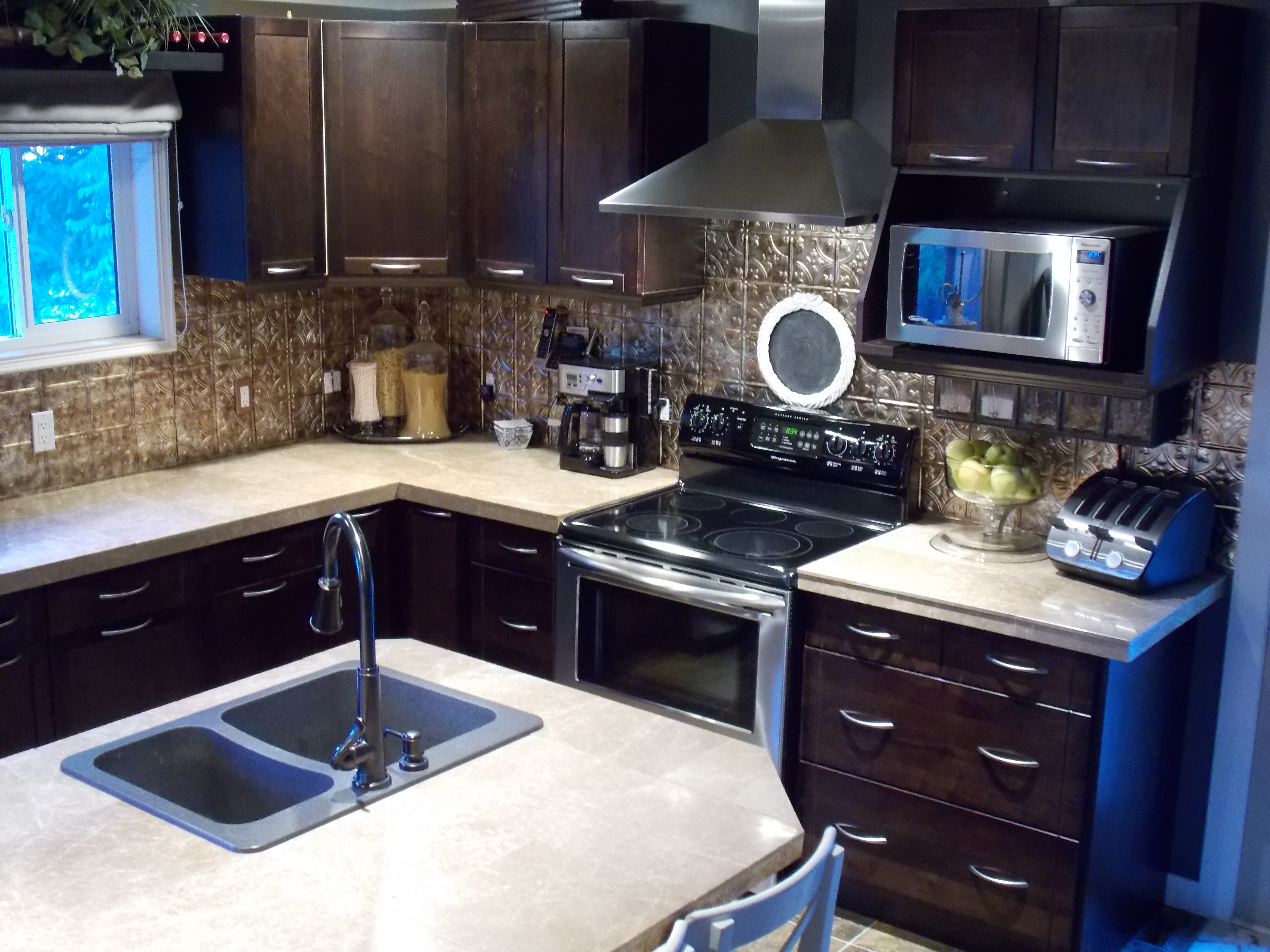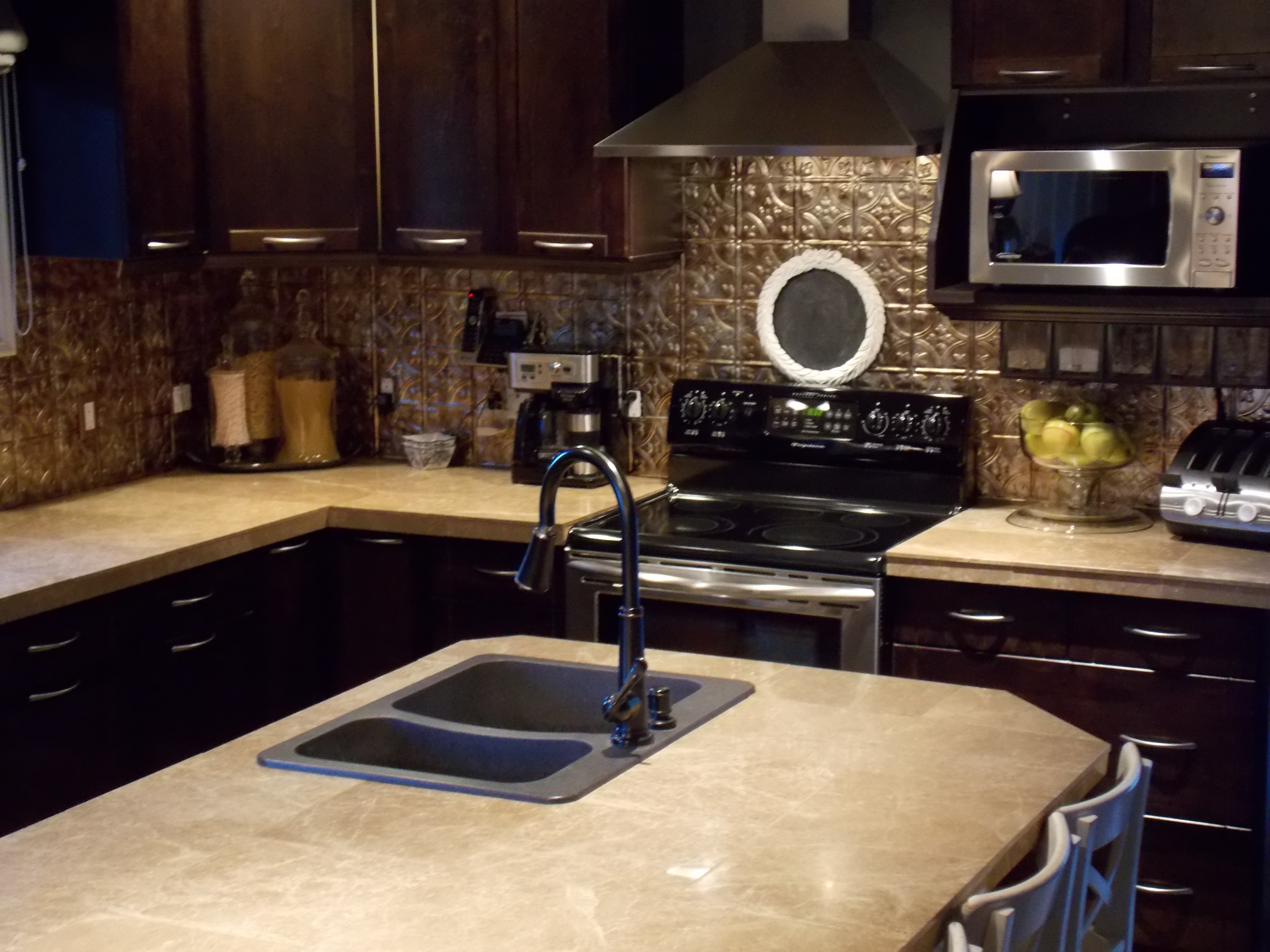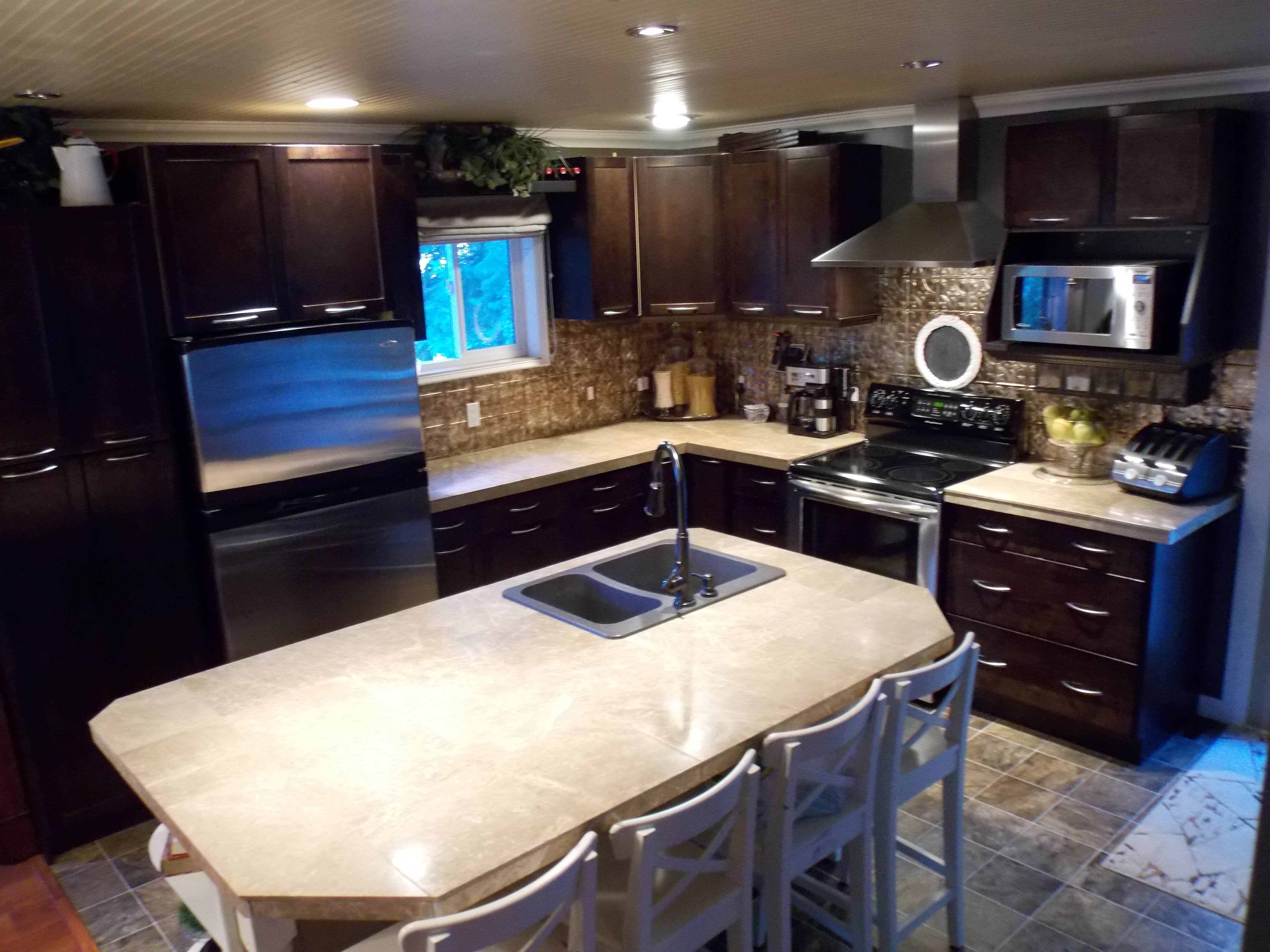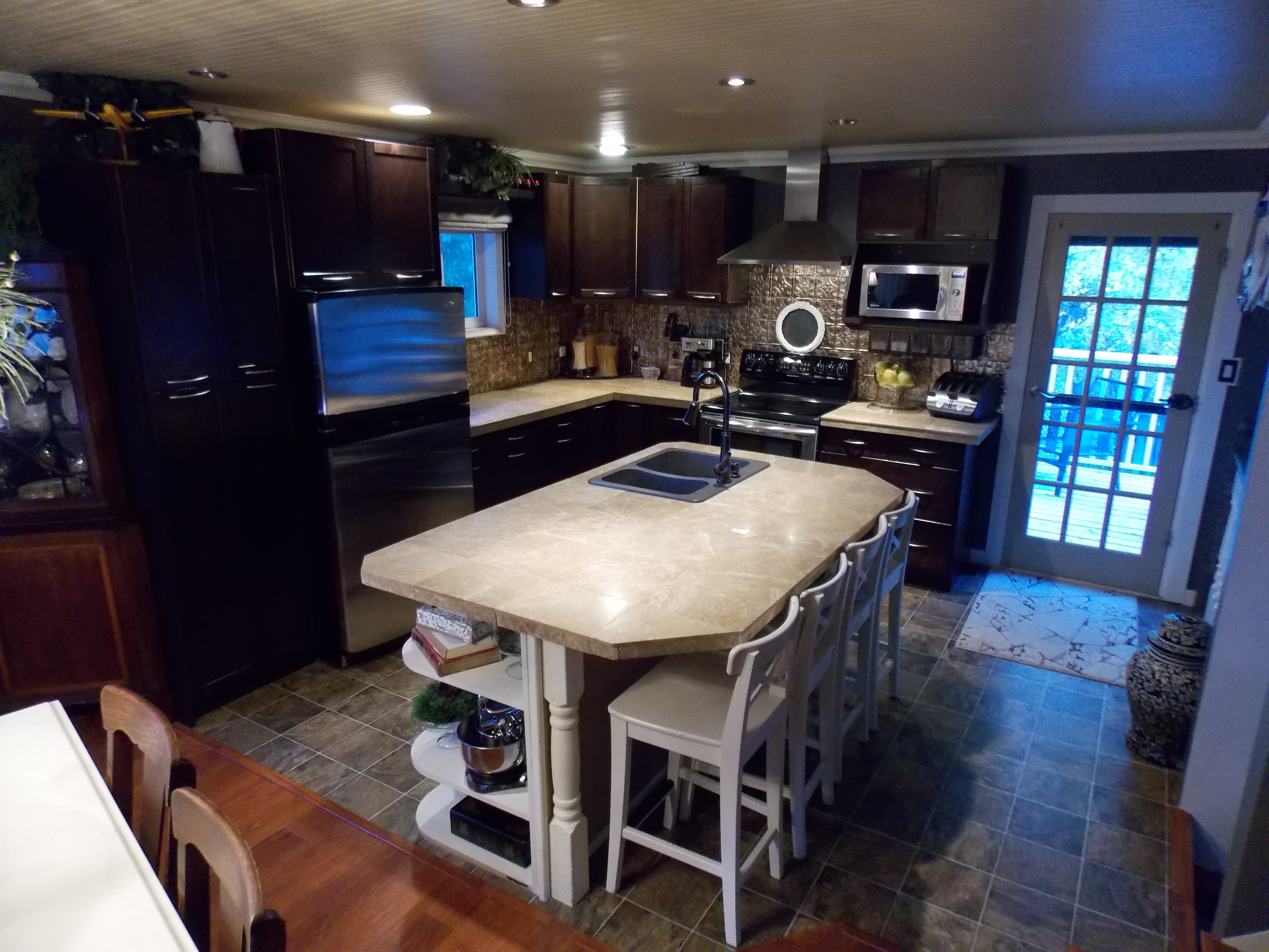 On to the kitchen… this kitchen has a nice sized island that houses the sink and the dishwasher as well as some storage shelves for cook books… of course we all know I’m not the best baker so these are just for decorations when it comes to me :0)! Cook books wha??? lol! There is also seating for four at the island…five if you really need it.