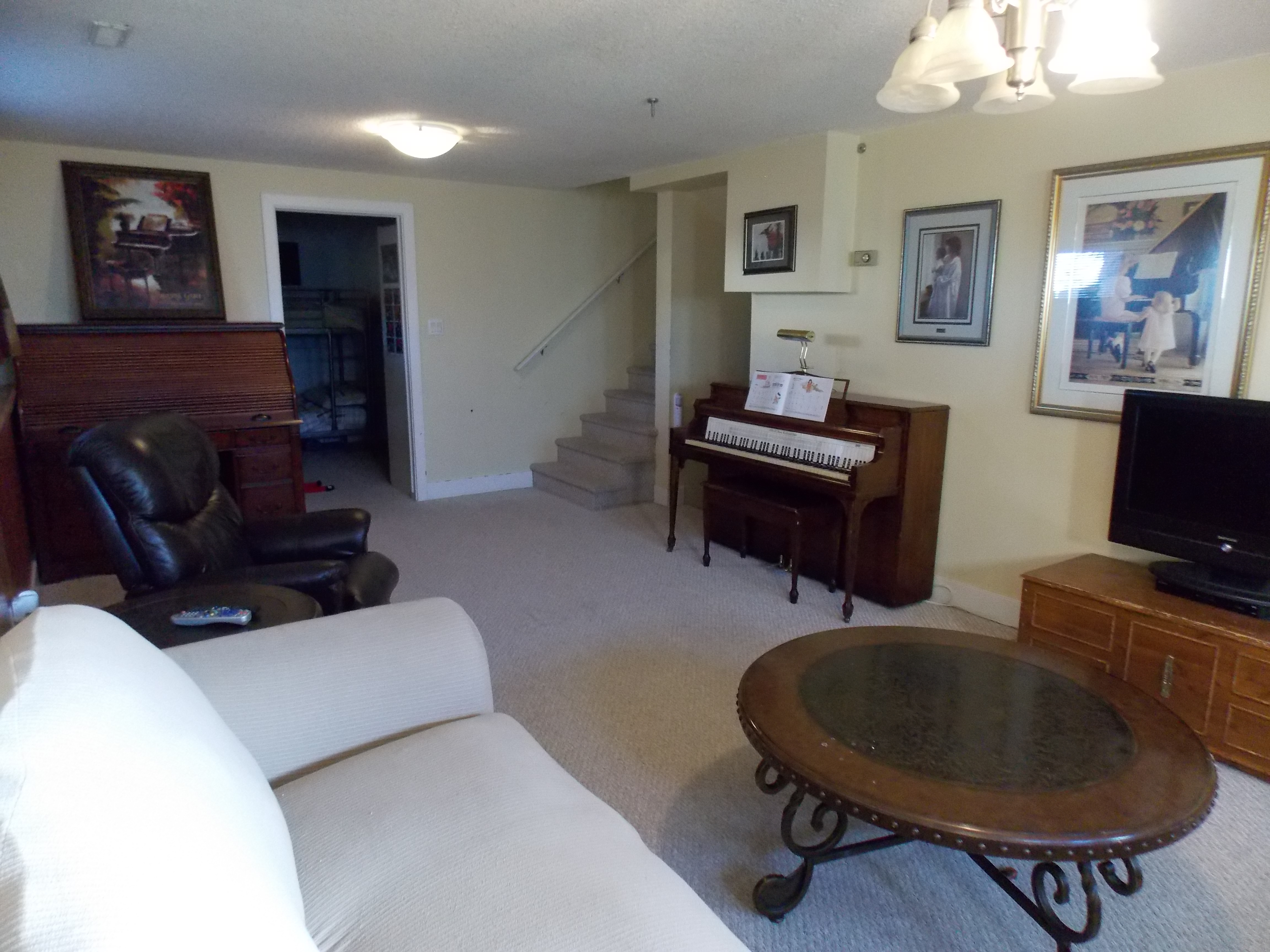 Here is the fourth level family room.  Keep in mind this is a kid’s room where they can be messy and yucky all they want … this is sort of a miss matched room filled with couches, T.V., piano and computer desk.  This is the place for watching T.V., being loud and rough housing :0)  “Sticky” is okay here!