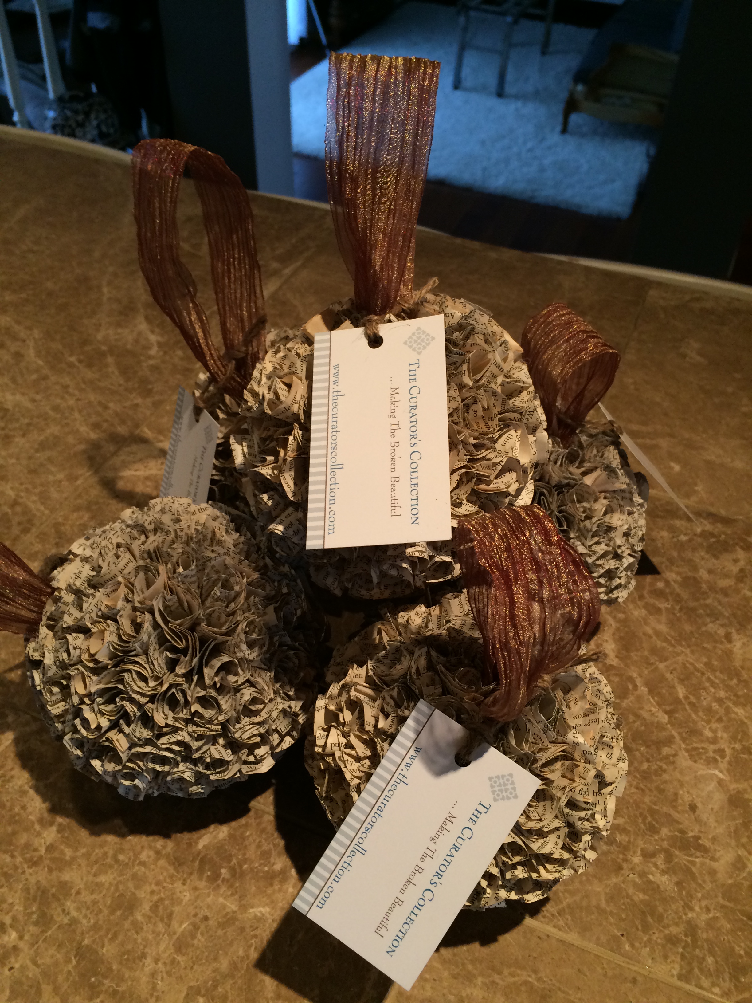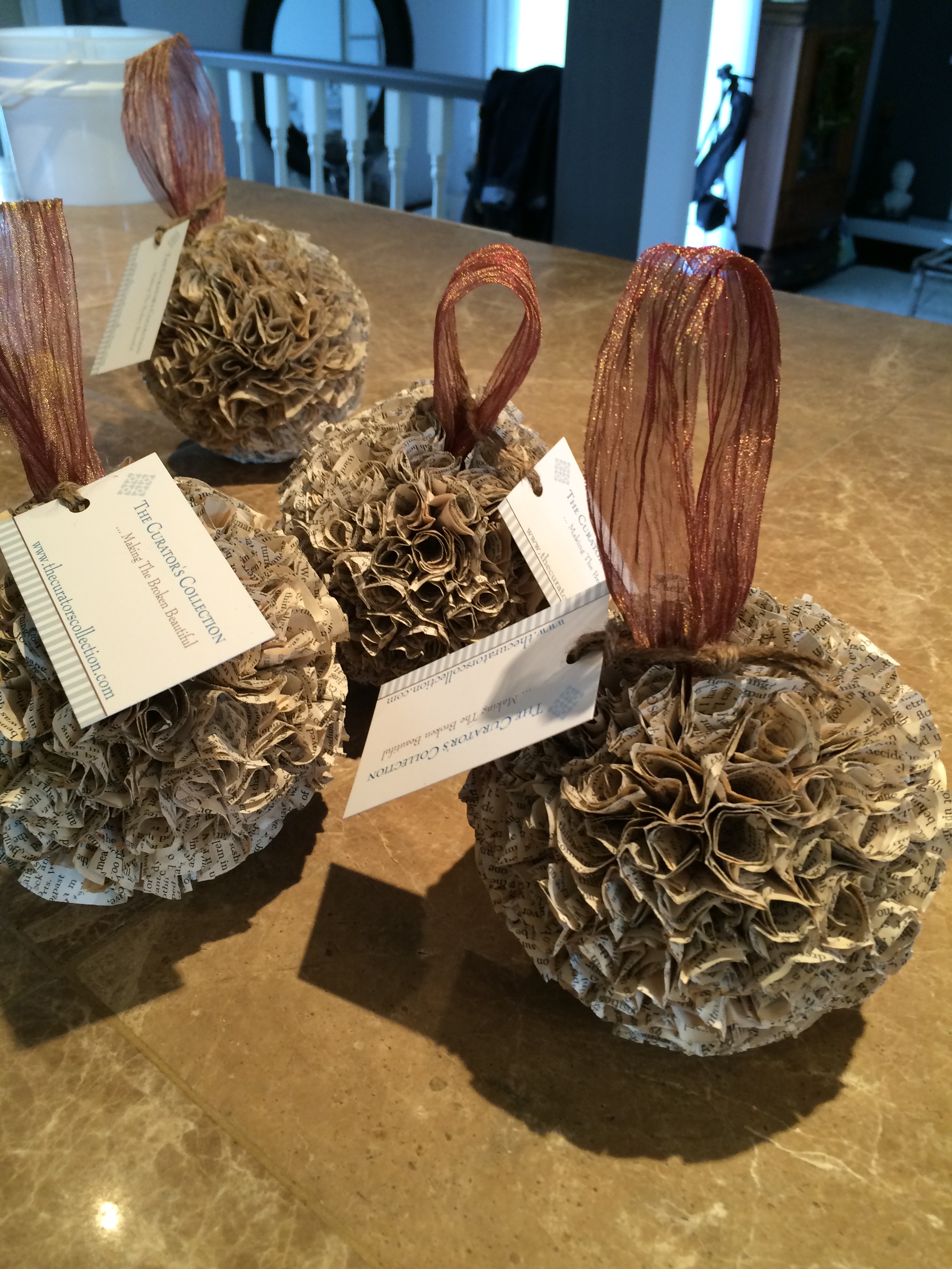 IMG_5714I think if you choose the right ribbon or even leave the ribbon off, you could keep them out all year in a decorative bowl or vignette on your coffee table as they aren’t specifically Christmas colors.  You could also use different paper or printed paper to create different designs… the possible variations of this craft are endless!