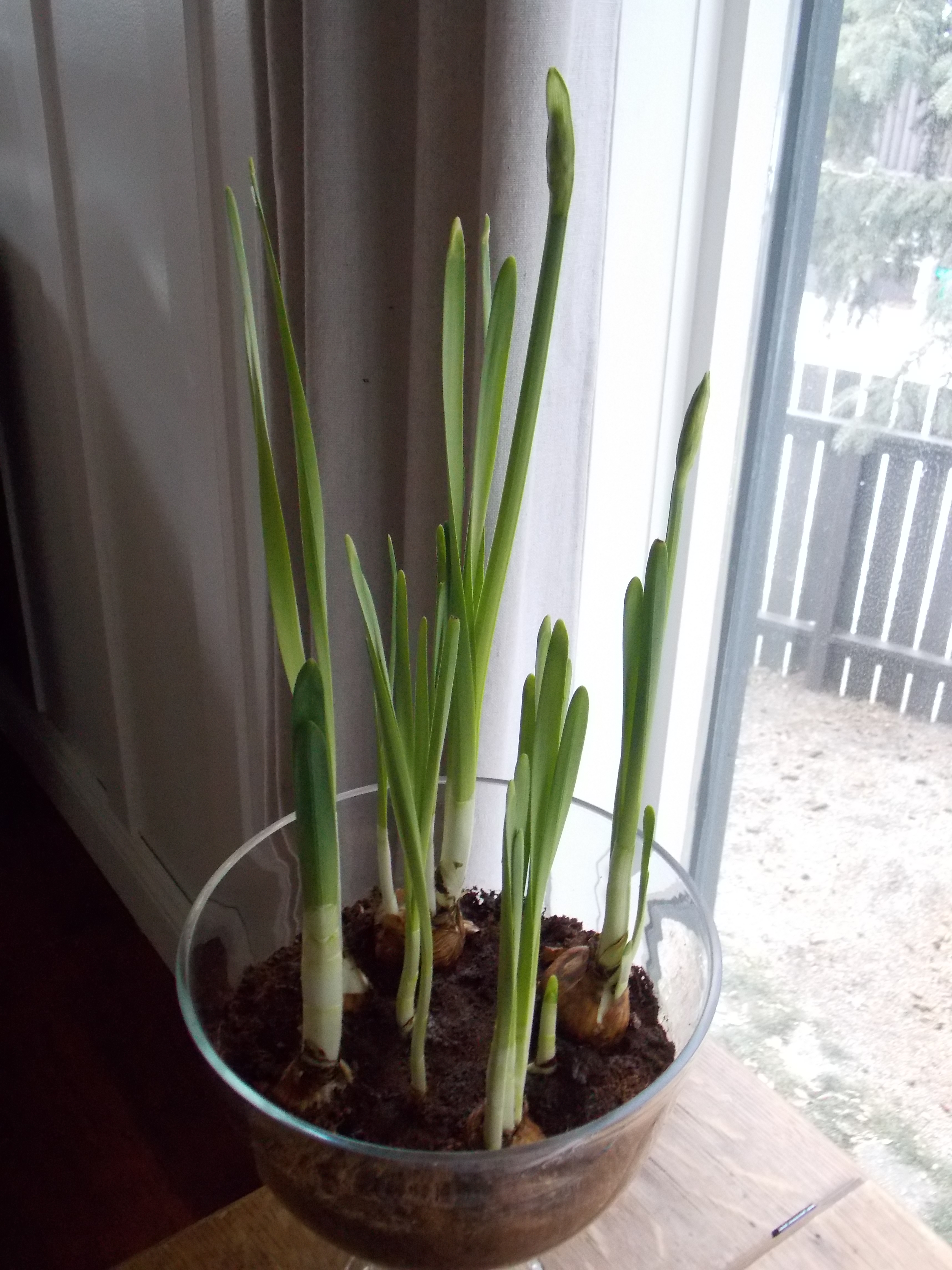 I planted them in a trifle bowl at the end of November.  I think that may have been a bit late but there are a few bulging flower buds just waiting to open.  Hopefully this happens by Christmas day!  I took these pics a few days ago, there are actually more buds now.