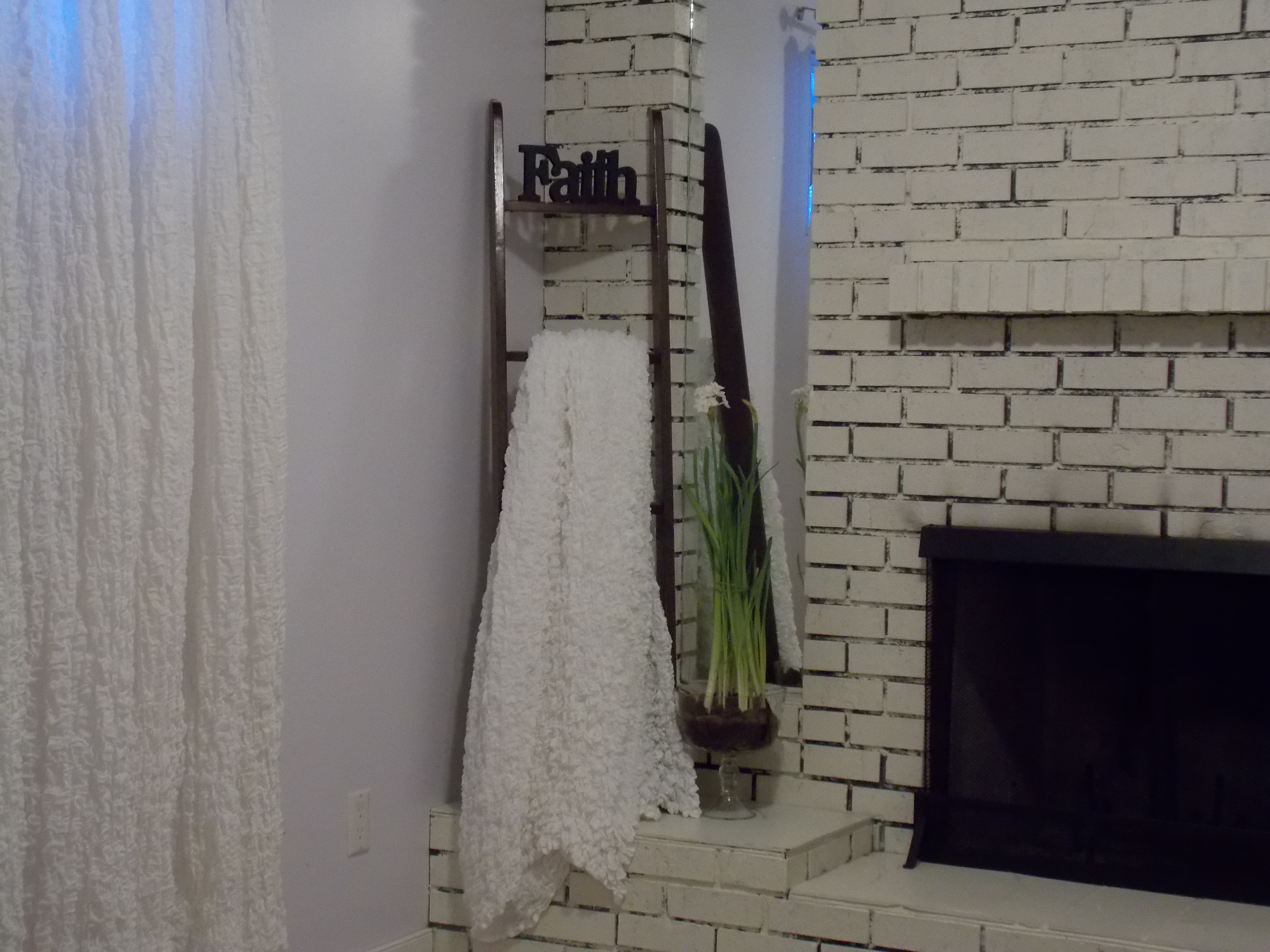 Left over throws were used to accent the bedding and one was draped over a old bunk bed ladder and adds a little more “softness to the overall look.  The placement of the paper whites I grew for Christmas look pretty paired with the ruffled blanket.