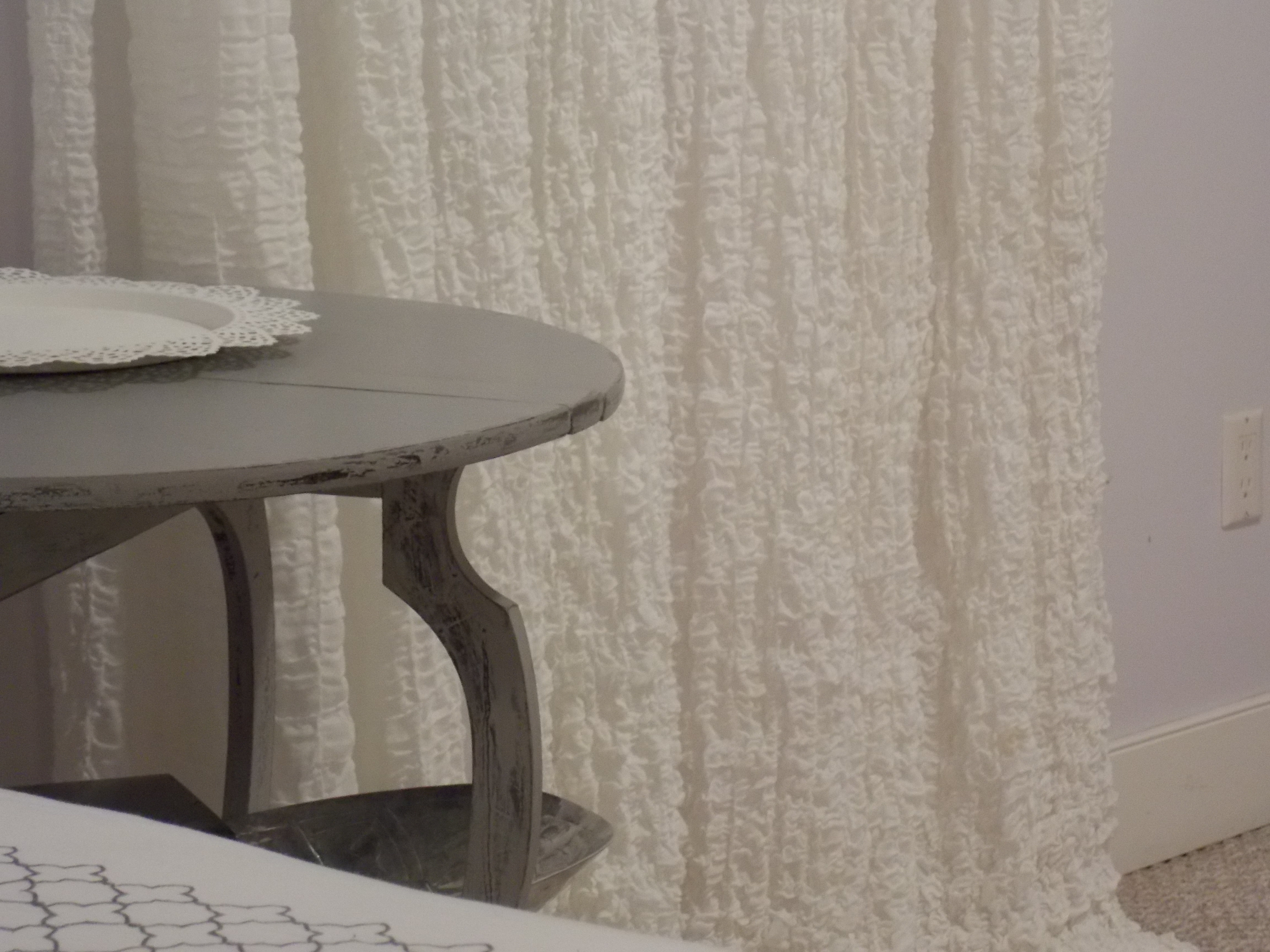 The only thing we are missing now are curtains and some accent lighting.  For the curtains I decided to scrounge around my storage room to see what we could recycle.  We came across some accent throws that all three of my girls used to have on their beds at one time.  They were white and frilly looking and feminine … perfect contrast to the masculine antler wall art.  I folded two blankets in half and hung them with curtain rings that have clips on them.  They make for perfect no sew curtains and if we choose to use them in the future for accent throws we can.