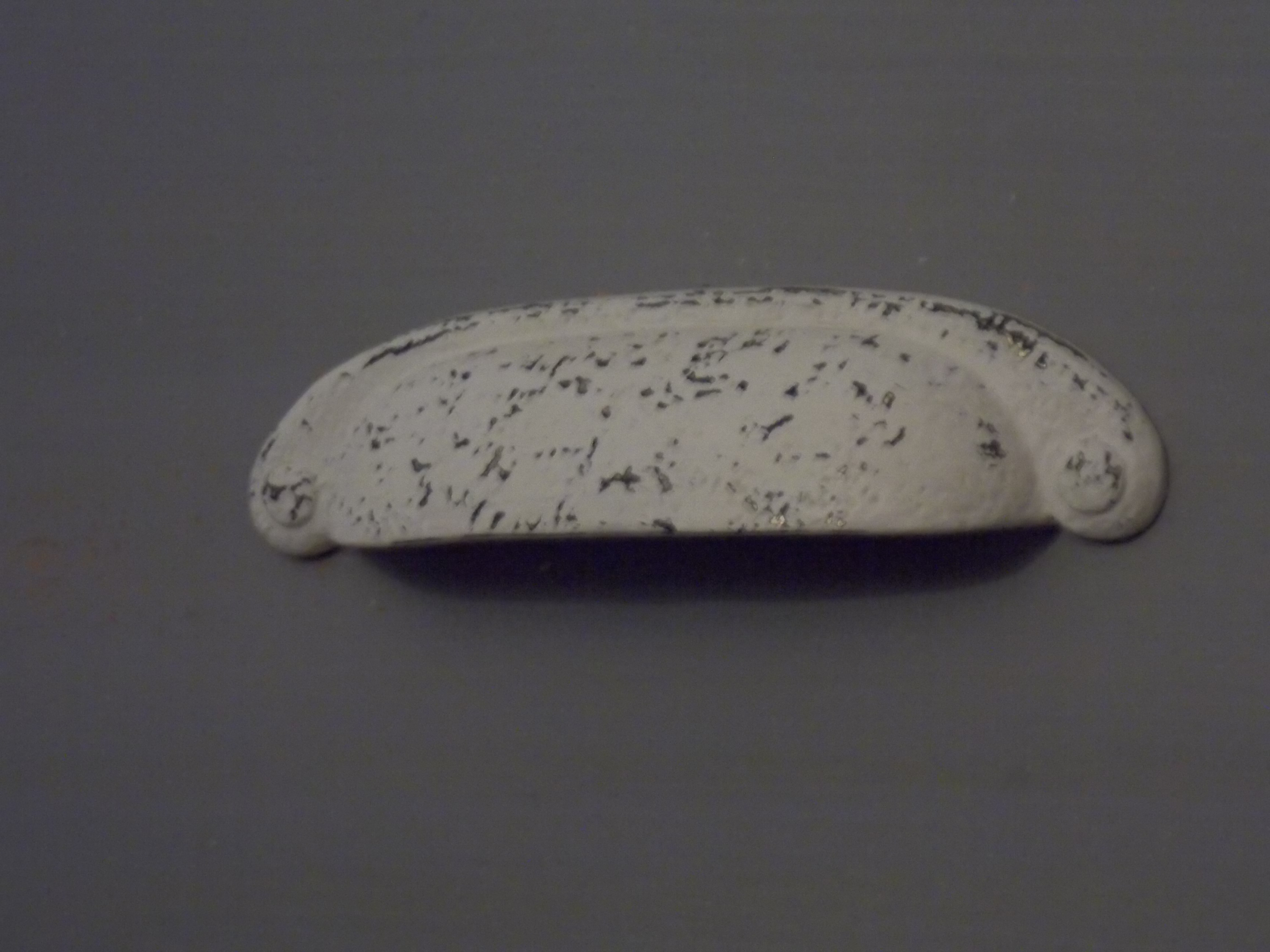 She did a wonderful job on both pieces.  I custom mixed some paint in a light grey tone and away she went.  She also decided that the night stand could use a new handle and chose a cup style handle instead which she painted in antique white and then lightly distressed.