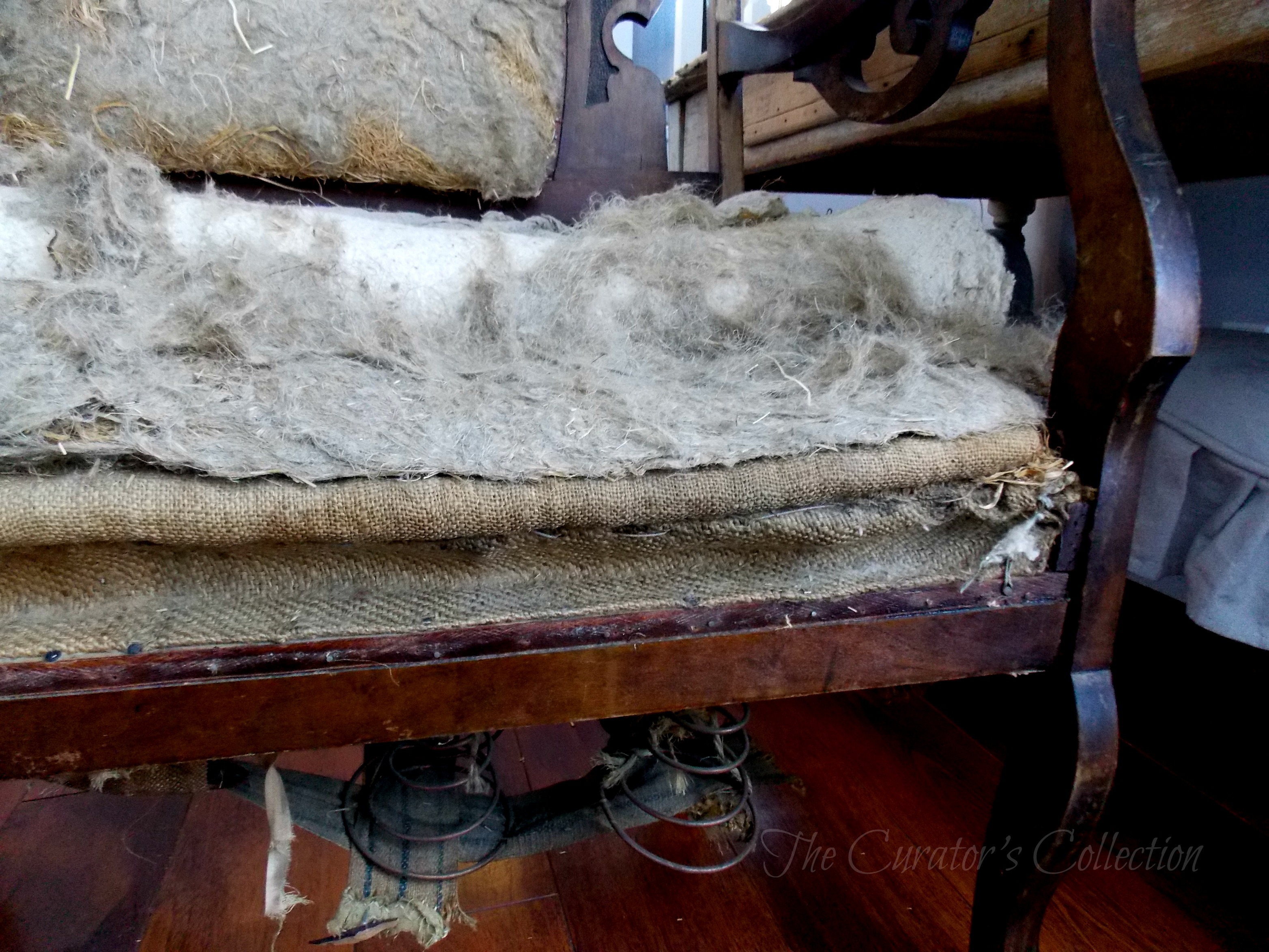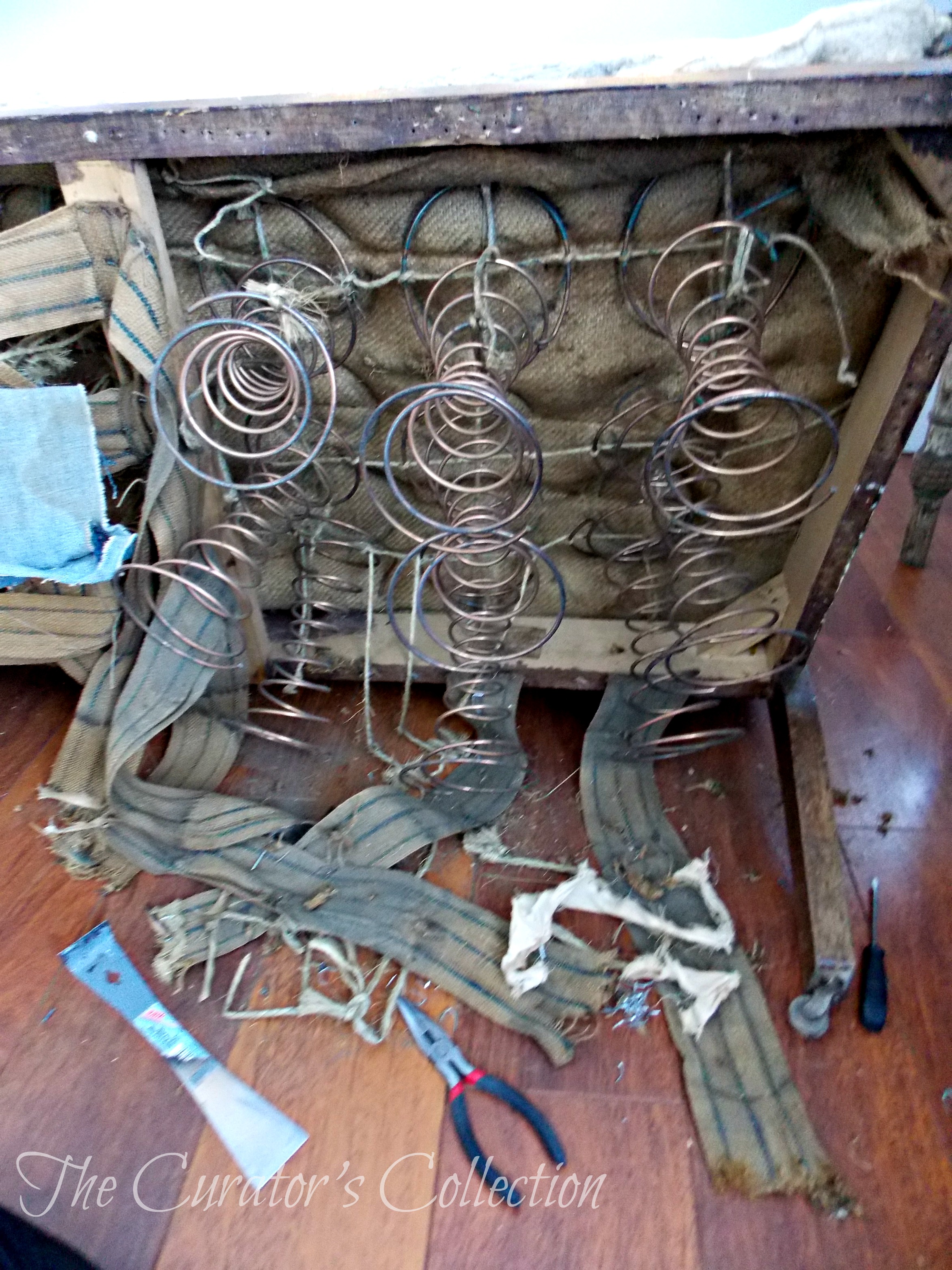 Originally I thought that I would remove the fabric, repair the springs and be able to use most of what was already there. Wrong! Once the fabric was removed I realized how dry and fragile the insides were. Crumbling to dust when touched in some places.