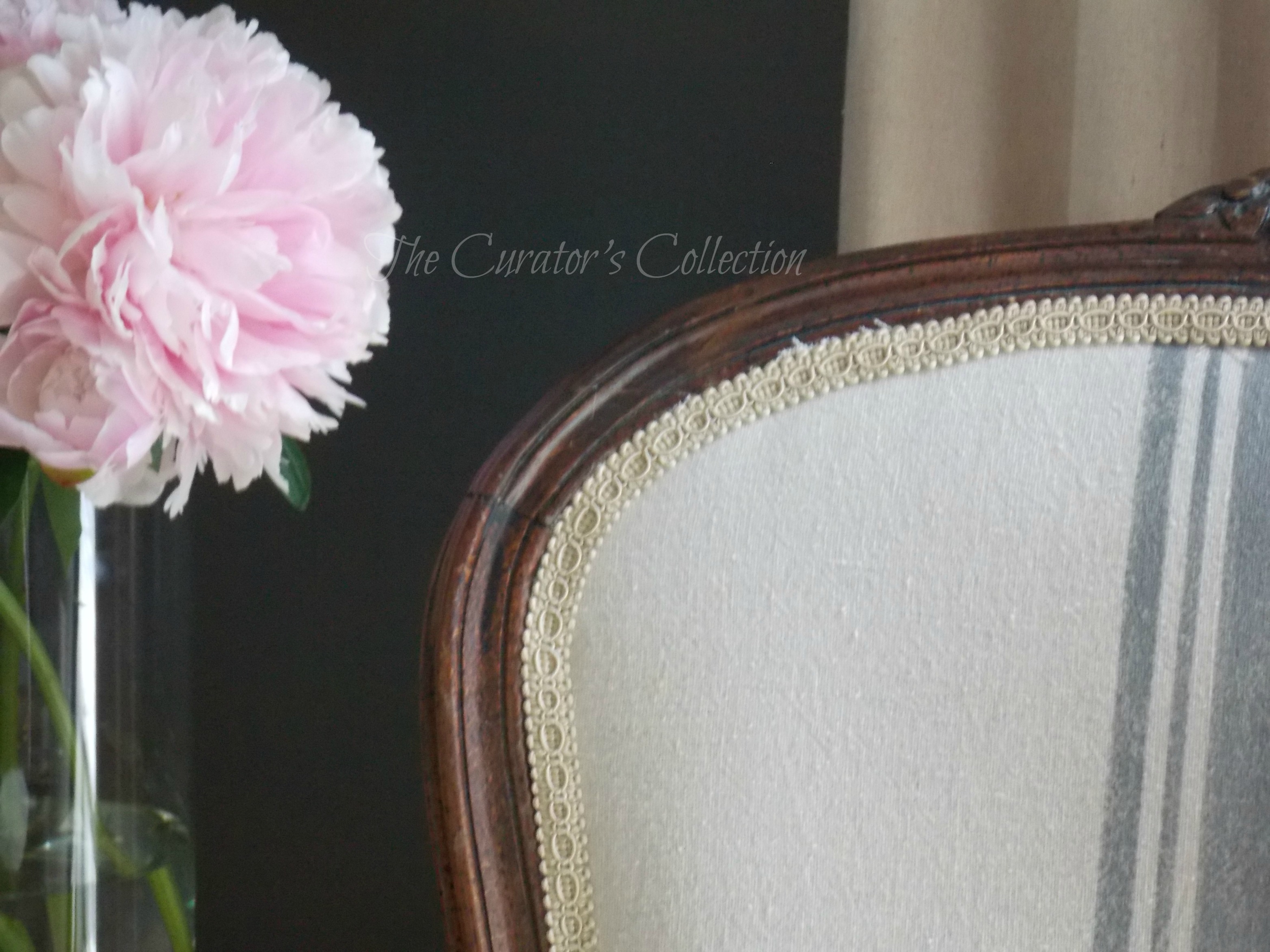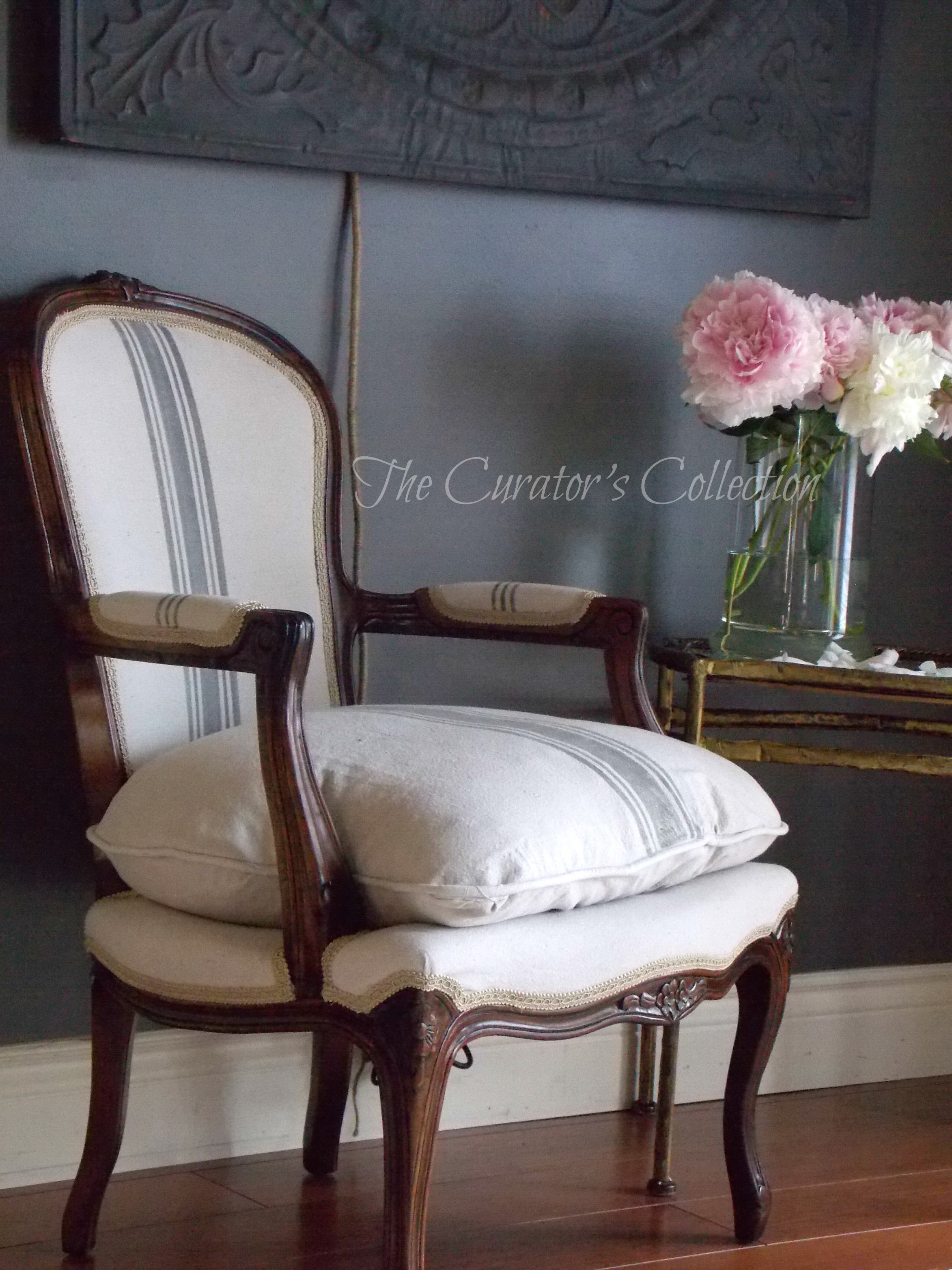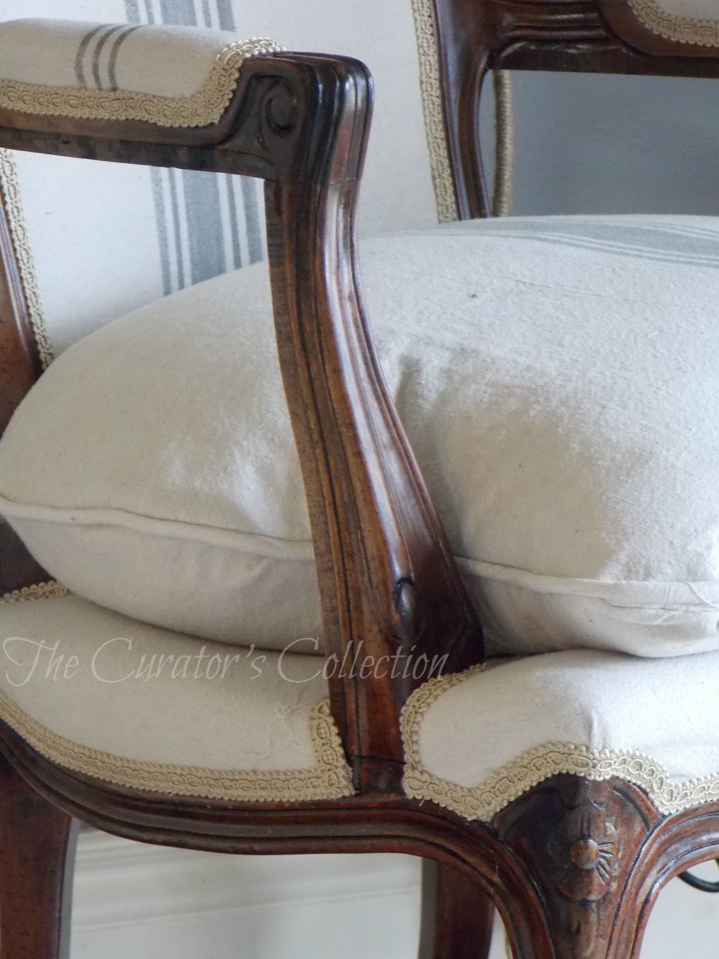 Terry, your chair is gorgeous! I LOVE, LOVE, LOVE it! The wood, the grain sack, the down filled cushion, truly amazing, and you did a great job. I’ve been looking for a pair of french chairs for years, but they’re pretty hard to come by at a decent price in Alaska. So, I’ll keep drooling over yours. Can’t wait to see the finished set!