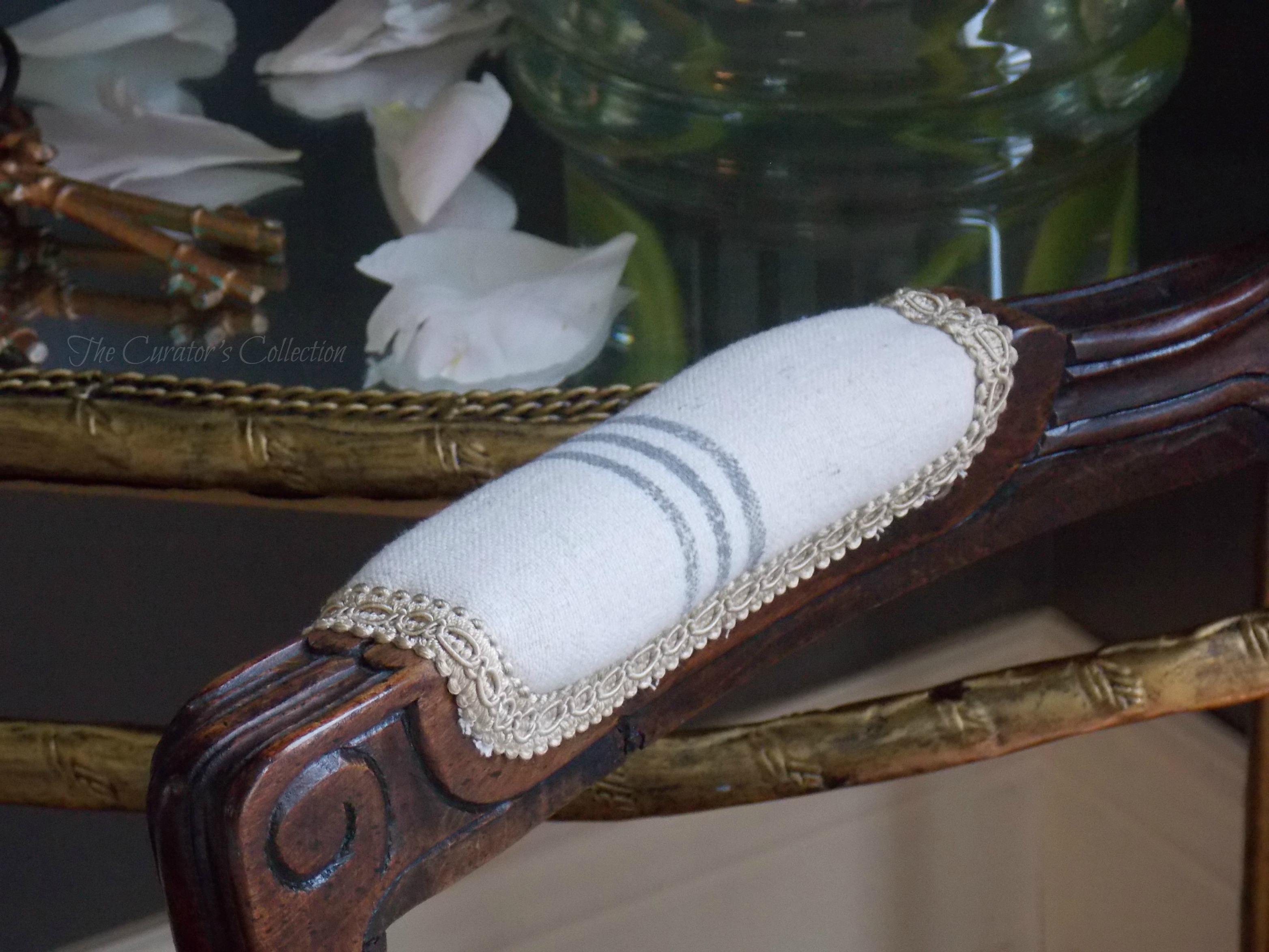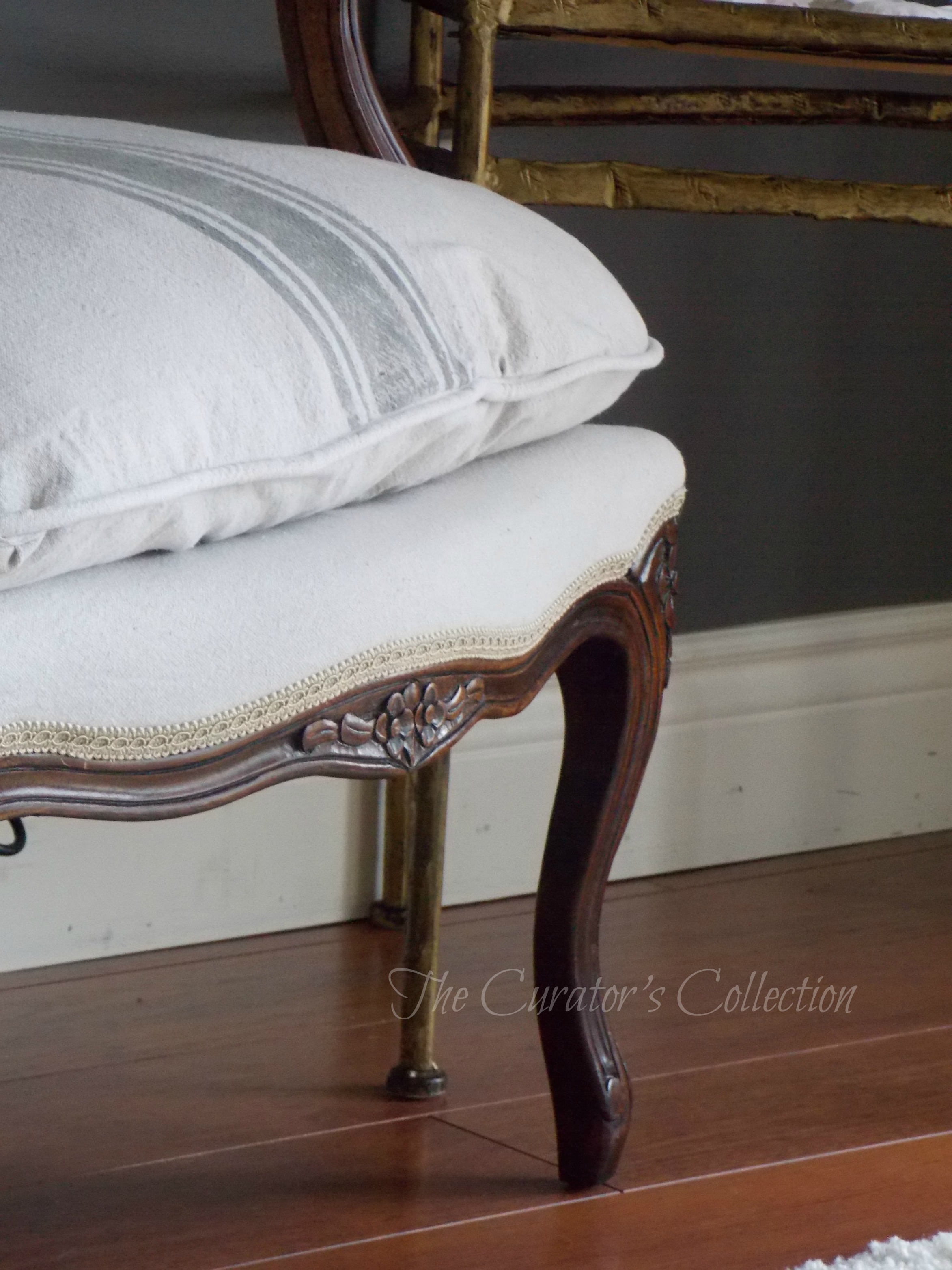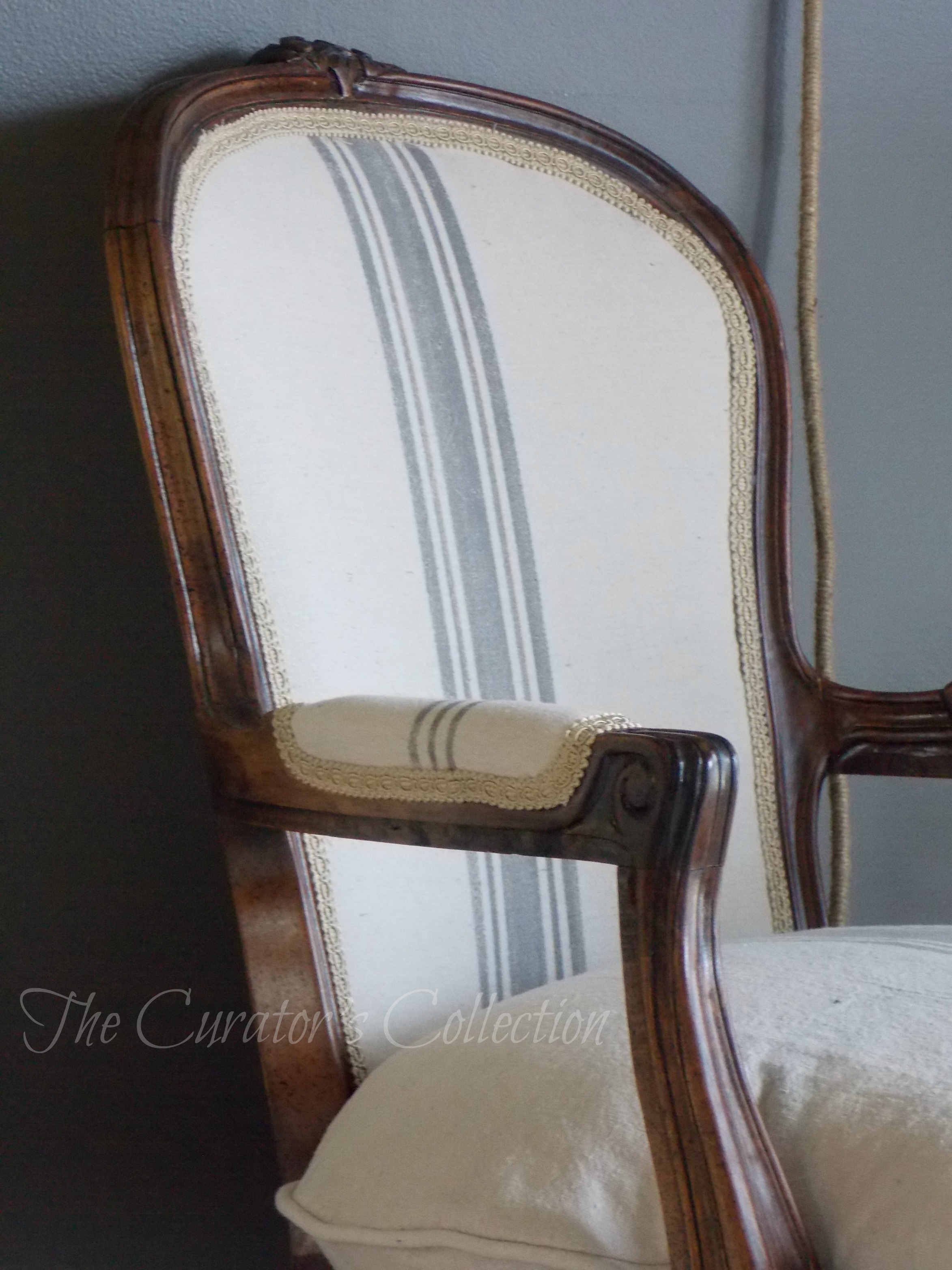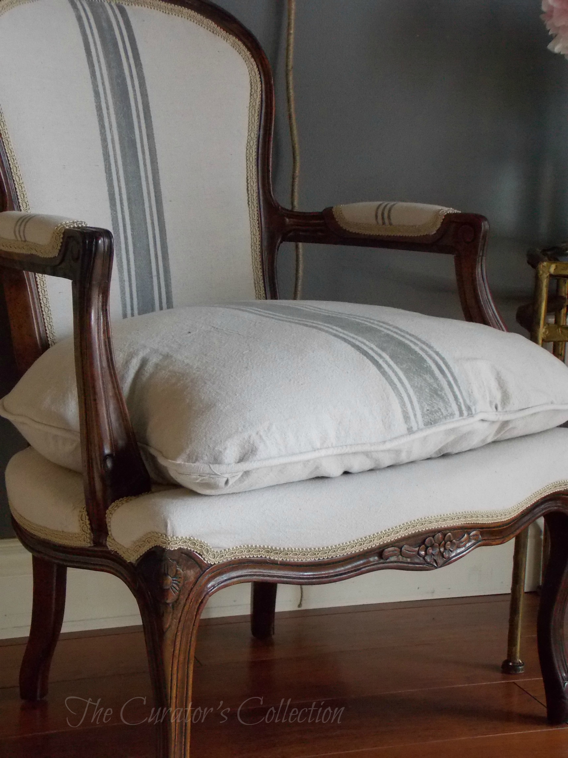 Terry, your chair is gorgeous! I LOVE, LOVE, LOVE it! The wood, the grain sack, the down filled cushion, truly amazing, and you did a great job. I’ve been looking for a pair of french chairs for years, but they’re pretty hard to come by at a decent price in Alaska. So, I’ll keep drooling over yours. Can’t wait to see the finished set!