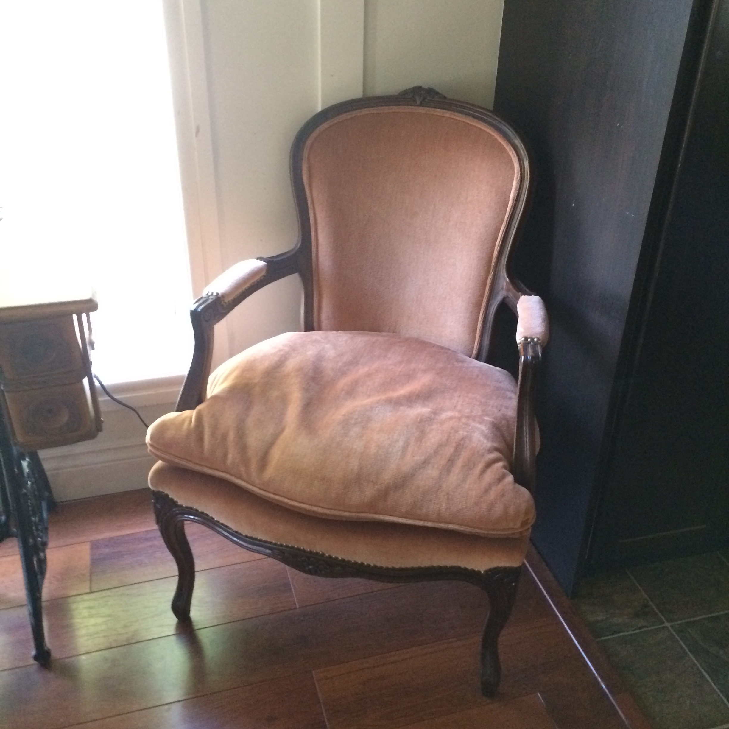 The only problem with it was that it was the wrong color and material. I’m really not a pink person when it comes to furniture and I don’t really care for velvet. Pretty as it was … it just didn’t go with my decor. It needed to be a little less feminine.