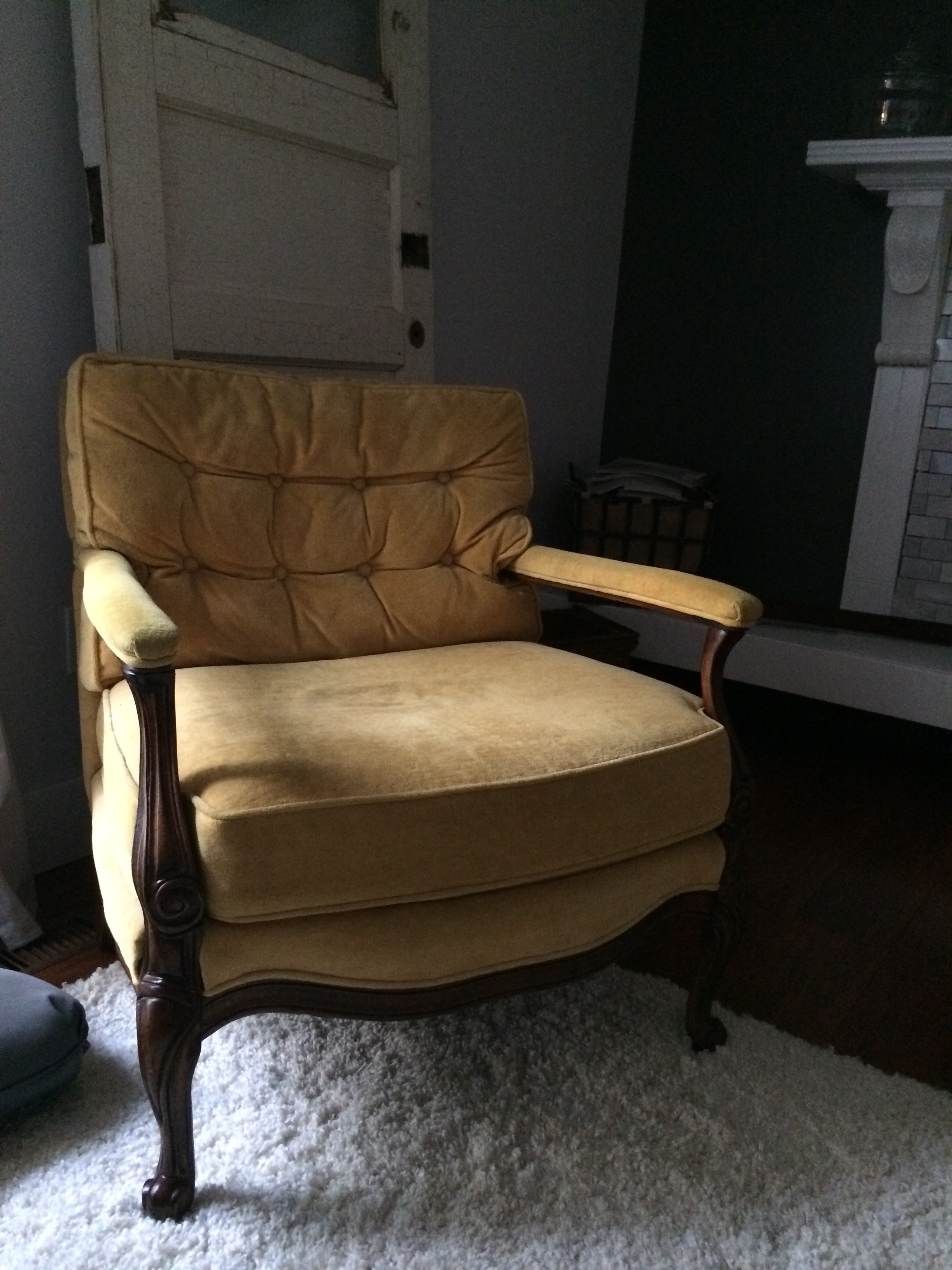 It was a steal of a deal for sure! Like the French chairs, this one was also like brand new. No stains, wear marks or fading and most importantly no smells! Just a weird yellow velvet … which actually looks perfect in her yellow bedroom! (sorry, no pictures to share on that yet)