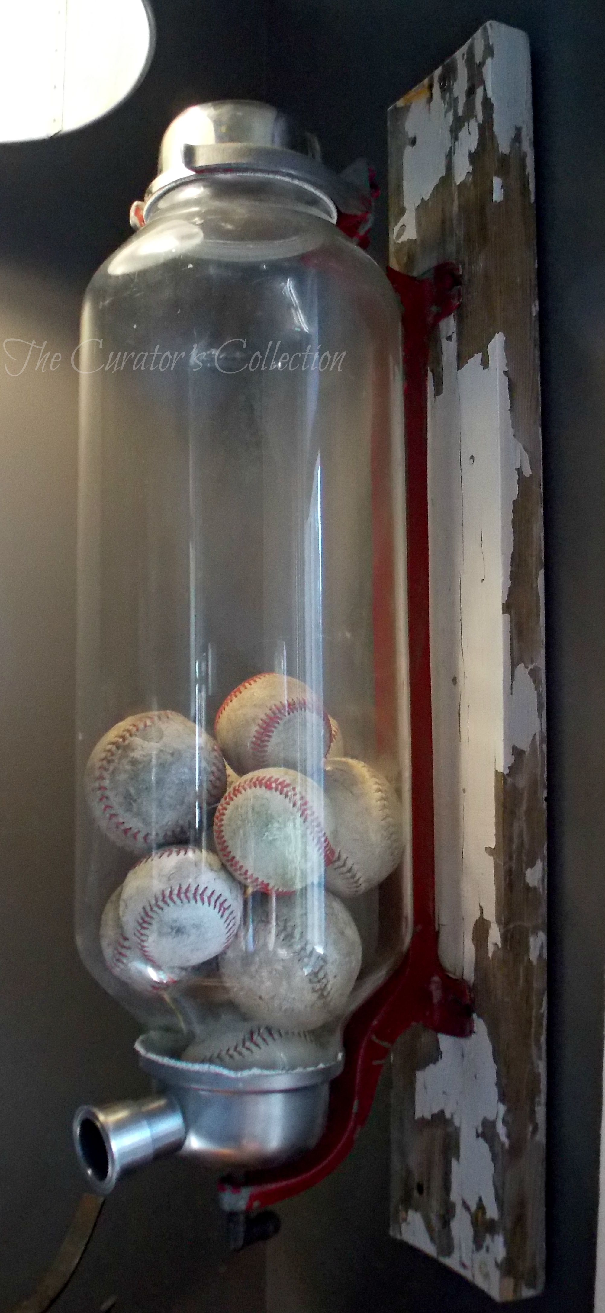… And what is it? It’s a calf feeder! I love how it looks hanging on the wall beside the window in our living room filled with old baseballs. The industrial pendant light and large tin wall hanging complement the look.