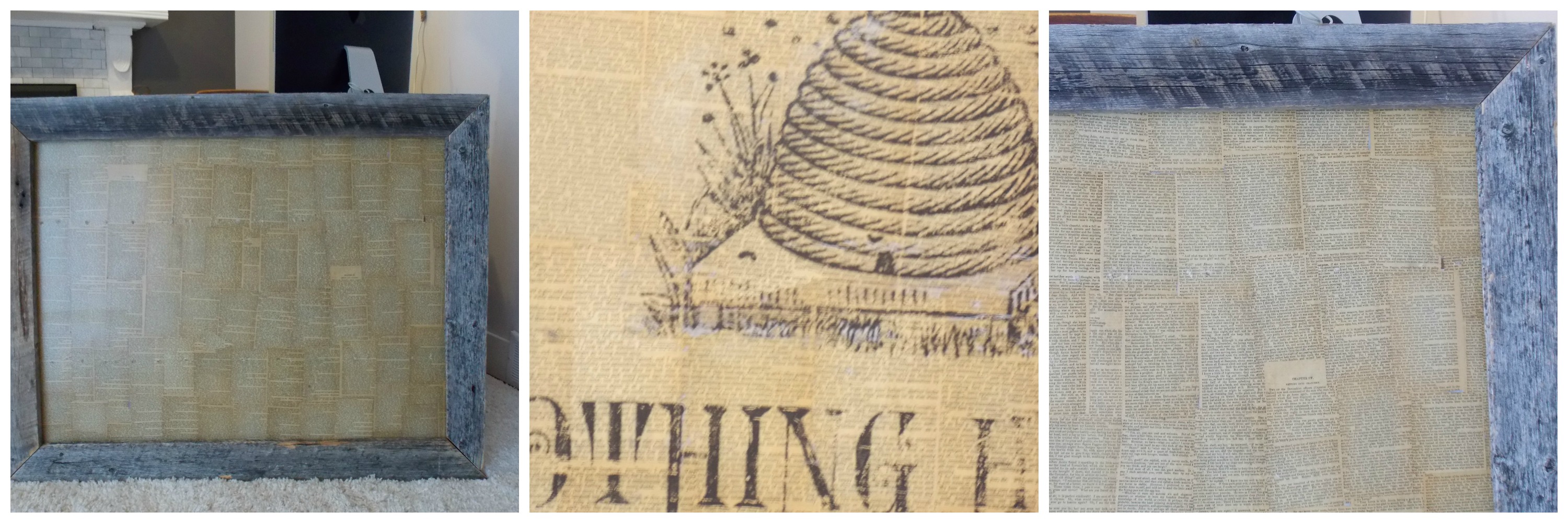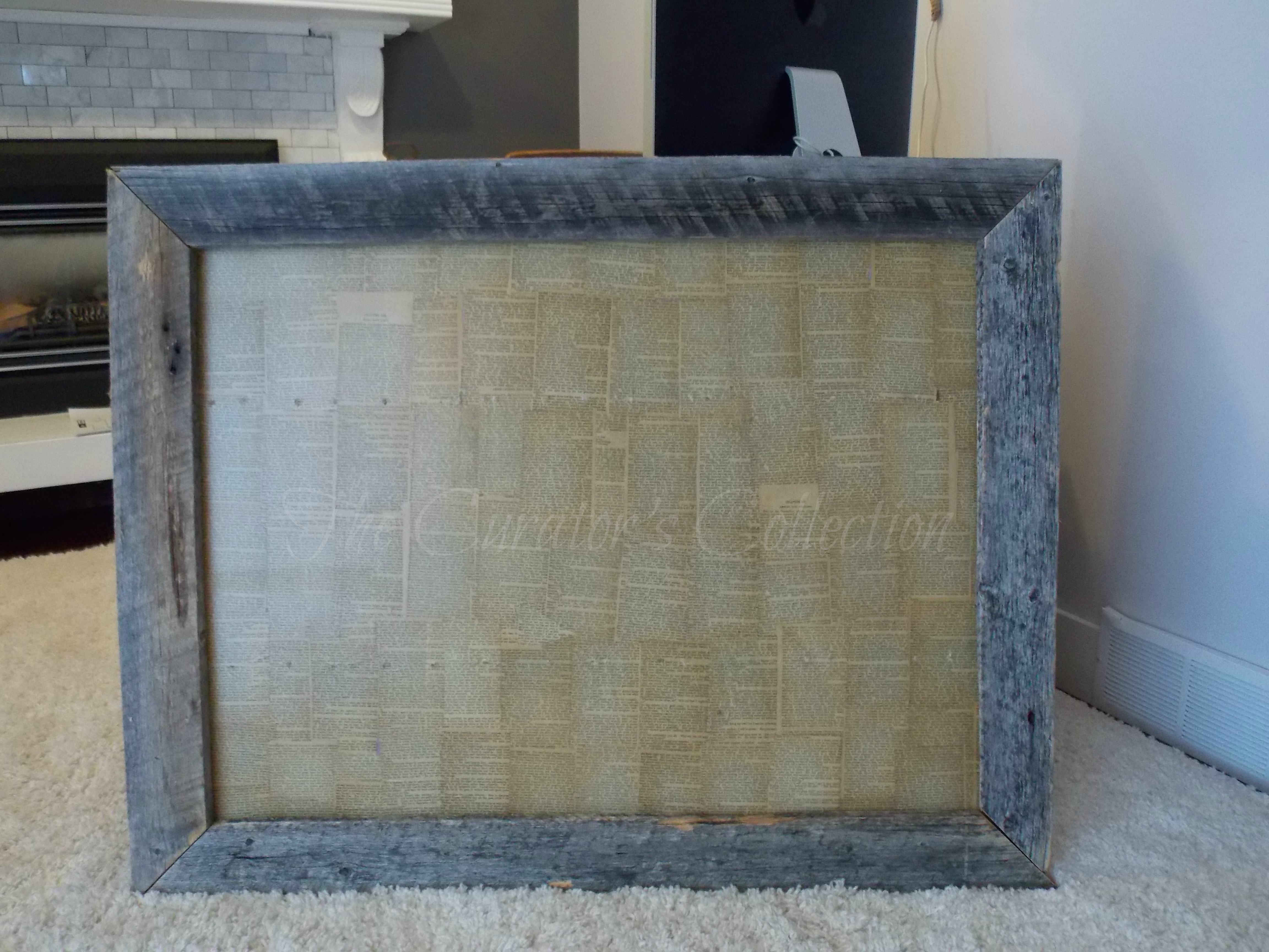 I started by cutting some old corral wood to create a rustic frame for the book page covered backboard.  After attaching it to the backboard this is what it looked like.