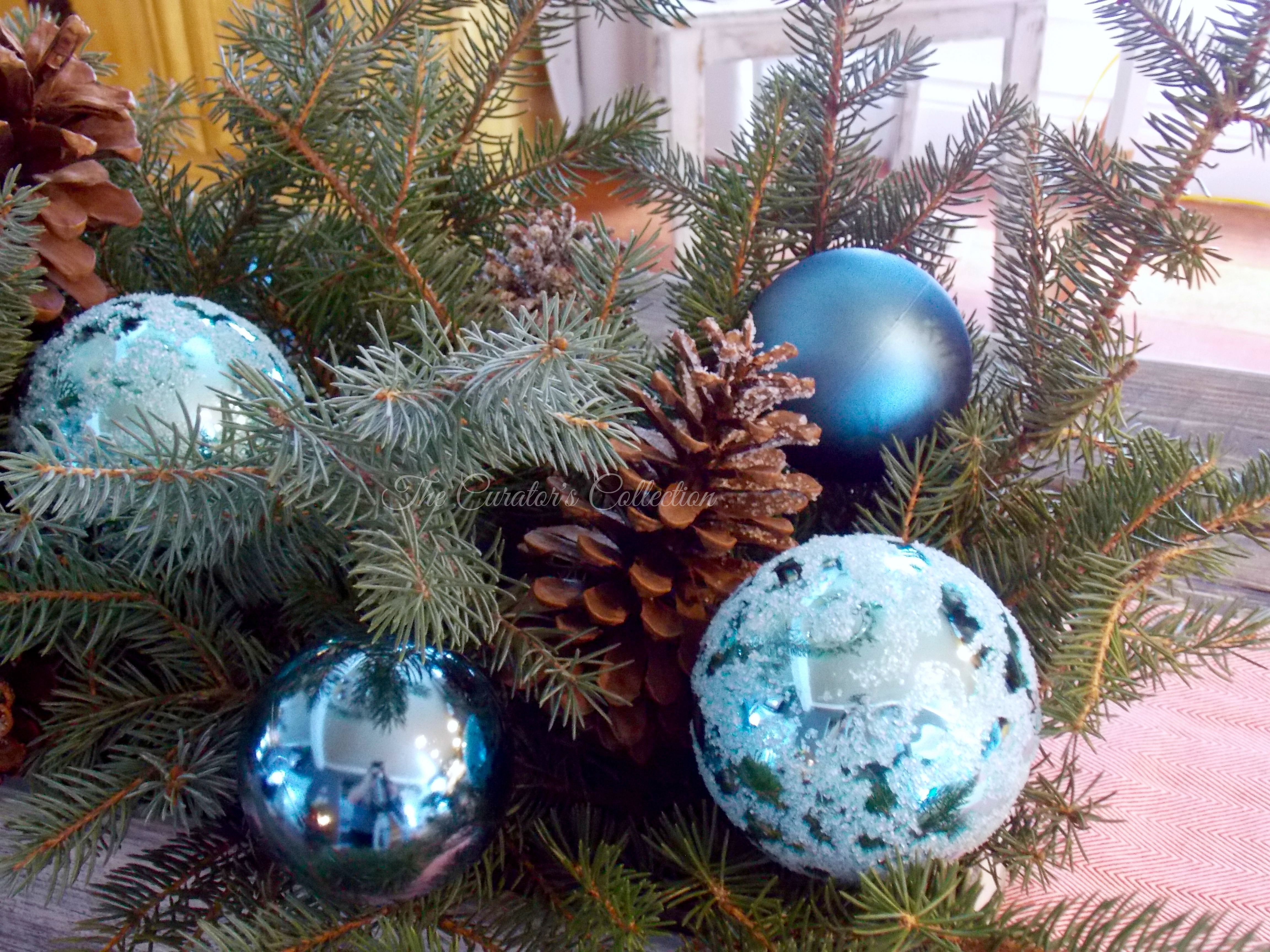 Anyways … here is my arrangement of greenery after adding a few baubles and large pinecones