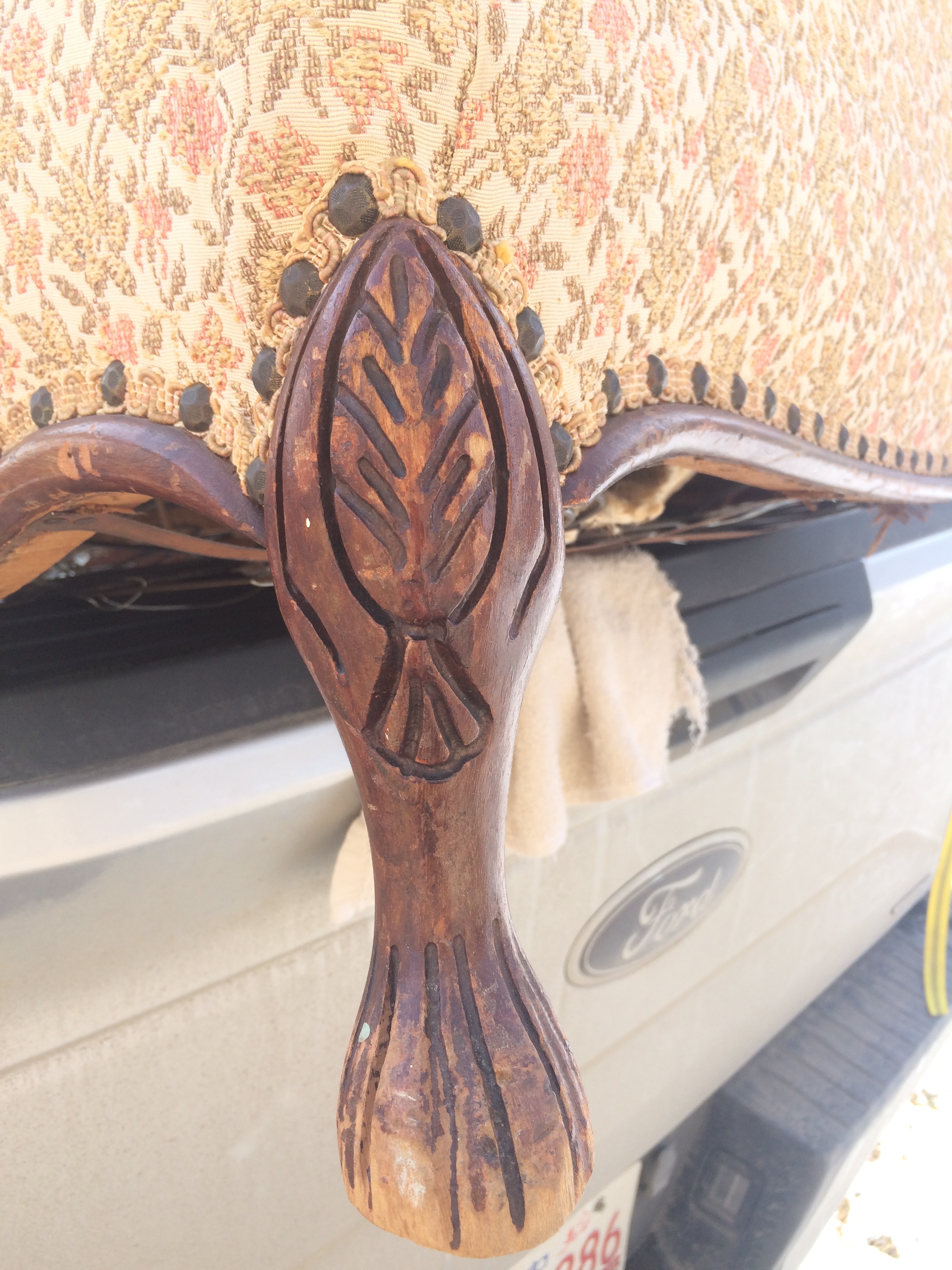 The underside is all springs and straw and original everything!  The woodwork needs much loving but that’s not an issue for me.  The fabric is in good shape and it doesn’t smell but I’m going to give it a little shabby chic dress!  And NO, this one will not sit naked for 2 years in my garage like the other one ;)