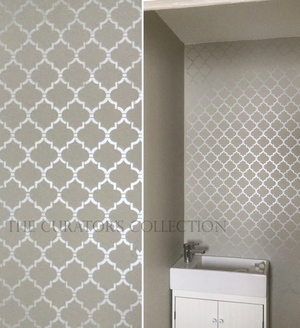 I managed to finish painting the small space and it looks great! I felt that this tiny 1/2 bath deserved a little something to jazz it up so I stencilled this pretty geometric shape on the sink wall using metallic paint. Having just one feature wall like this gives this ever so tiny space a little character.